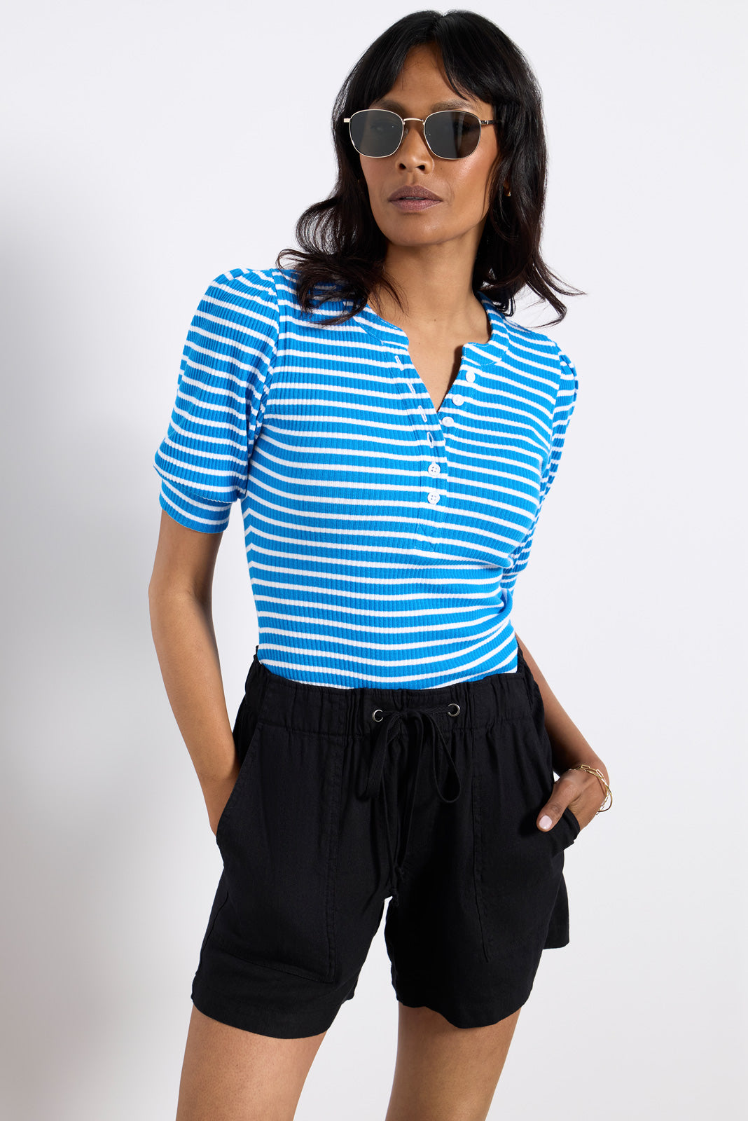 An elevated take on your everyday tee, the Jewel striped top by Rails is finished in soft ribbed fabric with a half button placket and elbow-length puff sleeves.