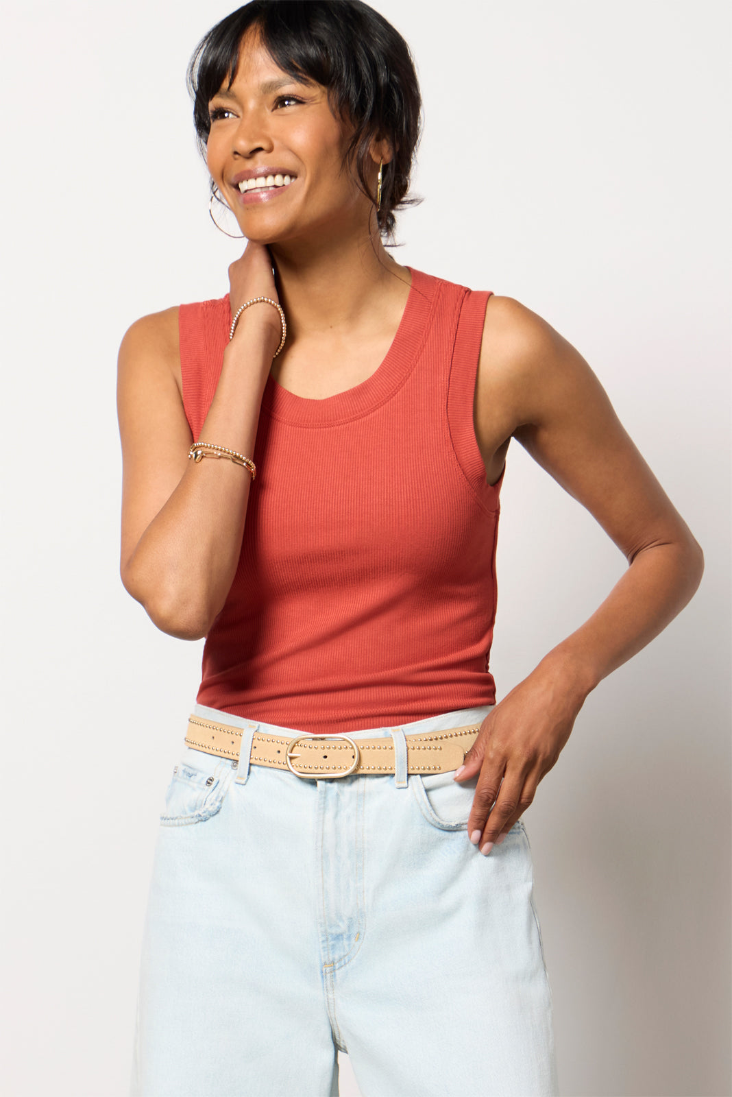 A versatile wardrobe staple, this LNA tank features a fitted crewneck silhouette in double-layered, soft rib knit fabric. Wear it alone or under a button-down, cardigan, or denim jacket.
