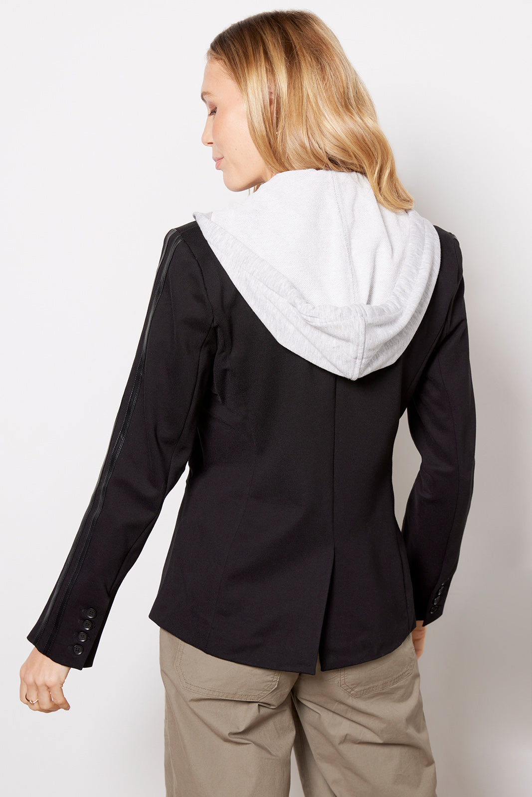 Work or weekend, this EVEREVE blazer will instantly elevate your look. The Jones St. Blazer features a single-breasted silhouette with a button closure, split back hem, and faux leather stripes on the sleeves. The detachable zip-up hood makes it the perfect two-in-one layer for dressing up or down.