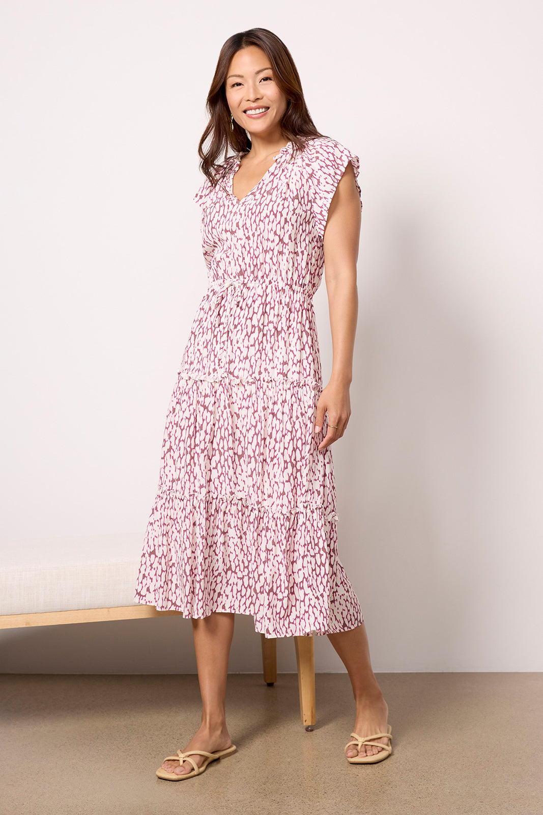 Fun and flirty, the Juni dress from Rails will be your go-to for all your summer occasions. Crafted in a lightweight crepe, this dress features a split neckline with a ruffle collar, flutter sleeves, a tie-shirred waist, and a fully lined tiered skirt.