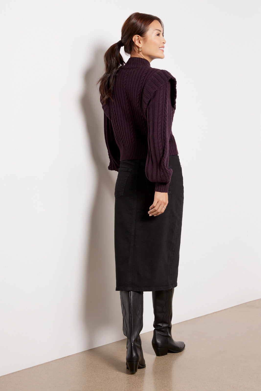 Crafted in a recycled wool material, this pullover sweater from Paige features cable stitching, a mock neck, and ruffles at the shoulders. Pair this sweater with your favorite jeans and a loafer for a polished look.