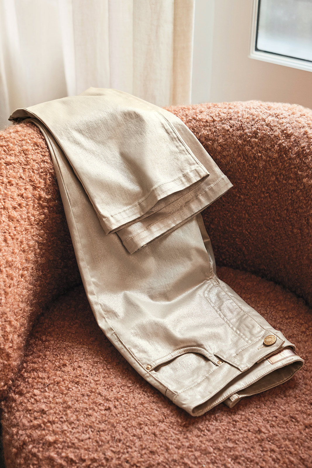 Metallic coated denim puts a chic, seasonal spin on the Kelsey pants by Kut From The Kloth. Designed with a flattering bootcut silhouette and ankle-length hems, these shimmery gold-tone pants are perfect for your fall rotation with sweaters, blouses, and button-downs.