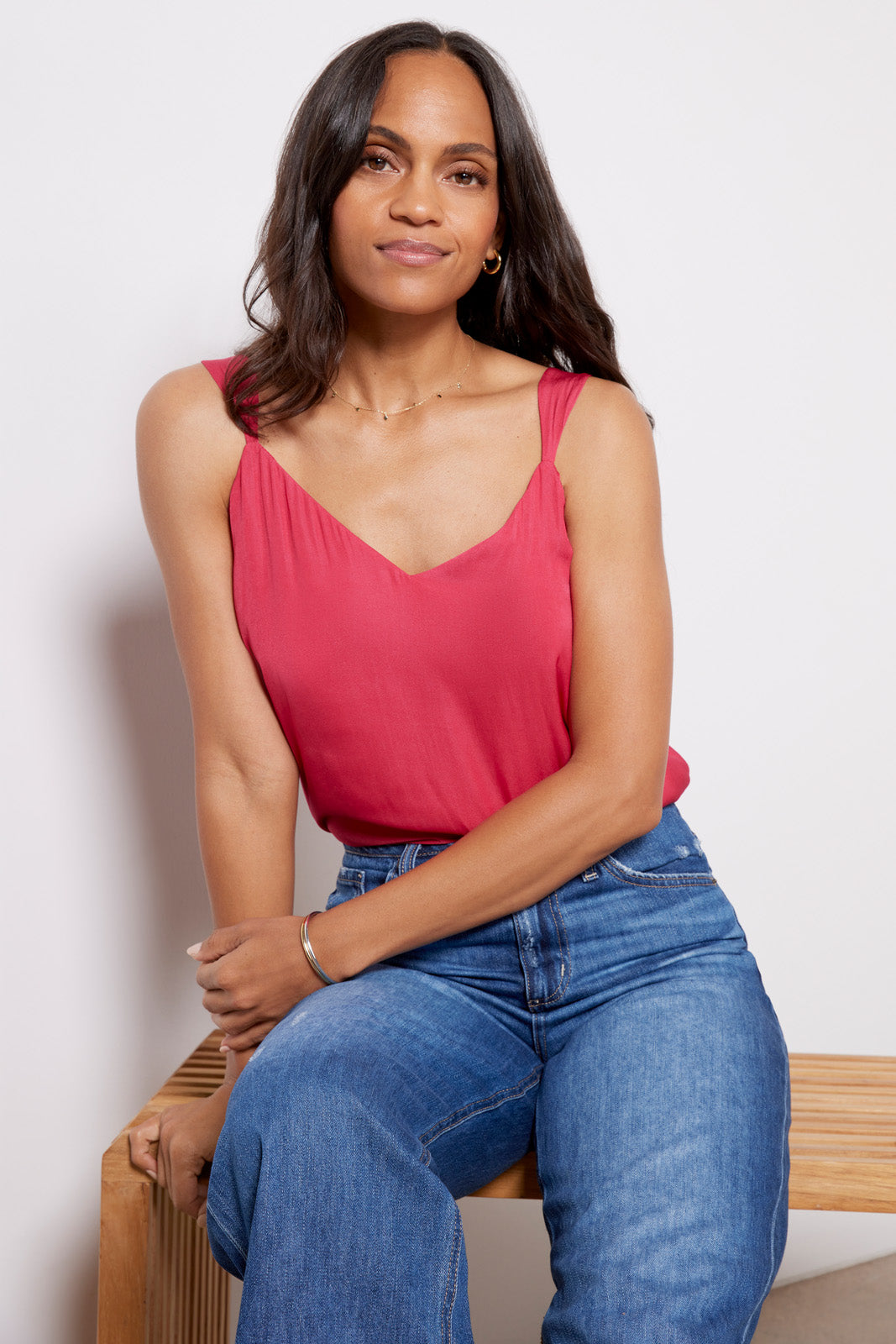 Satin fabric updates this sleek cami silhouette by EVEREVE featuring a flattering v-neckline, relaxed silhouette, and adjustable shoulder straps. Tuck into trousers, or keep it casual with cutoffs and strappy sandals.