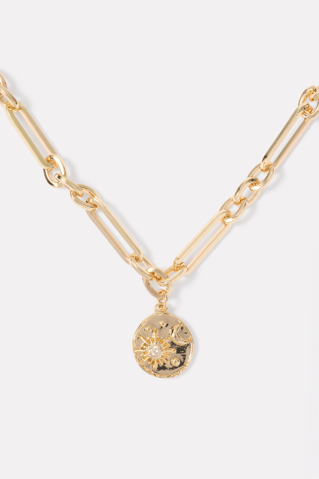 Perfect for wearing alone or layered, the LaSalle long chain necklace by EVERVE is finished in 14k gold plating and features a coin charm with a sun-and-moon design.