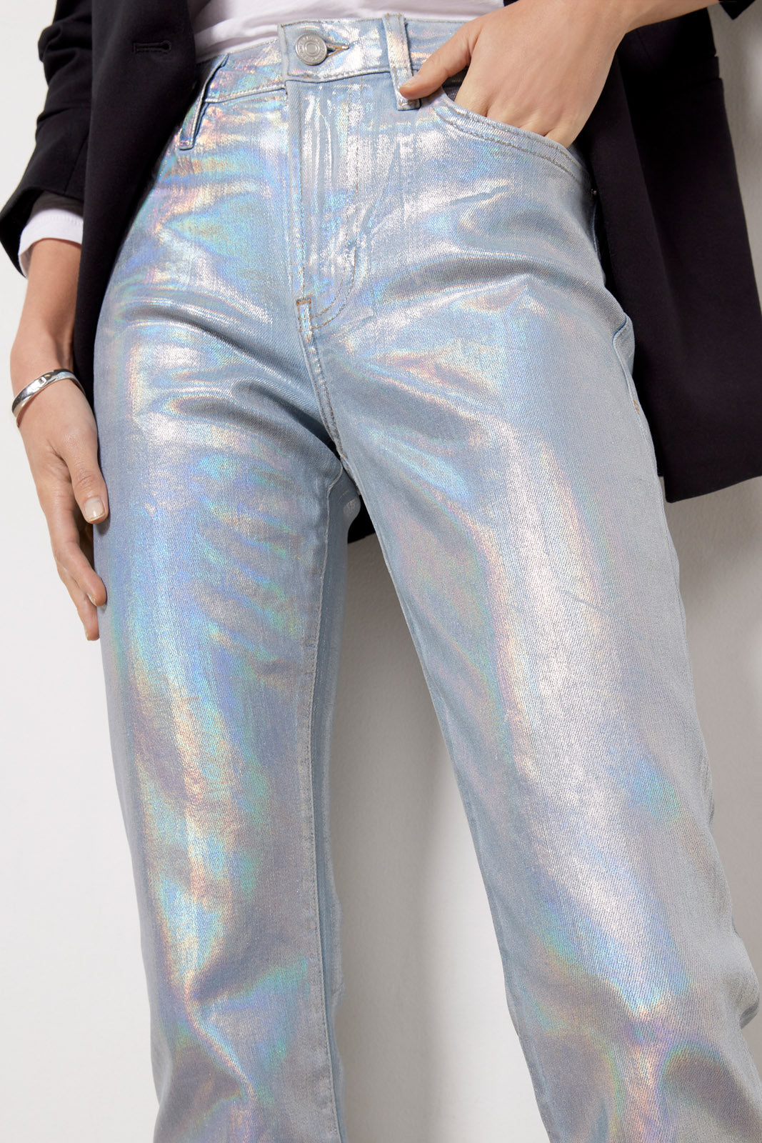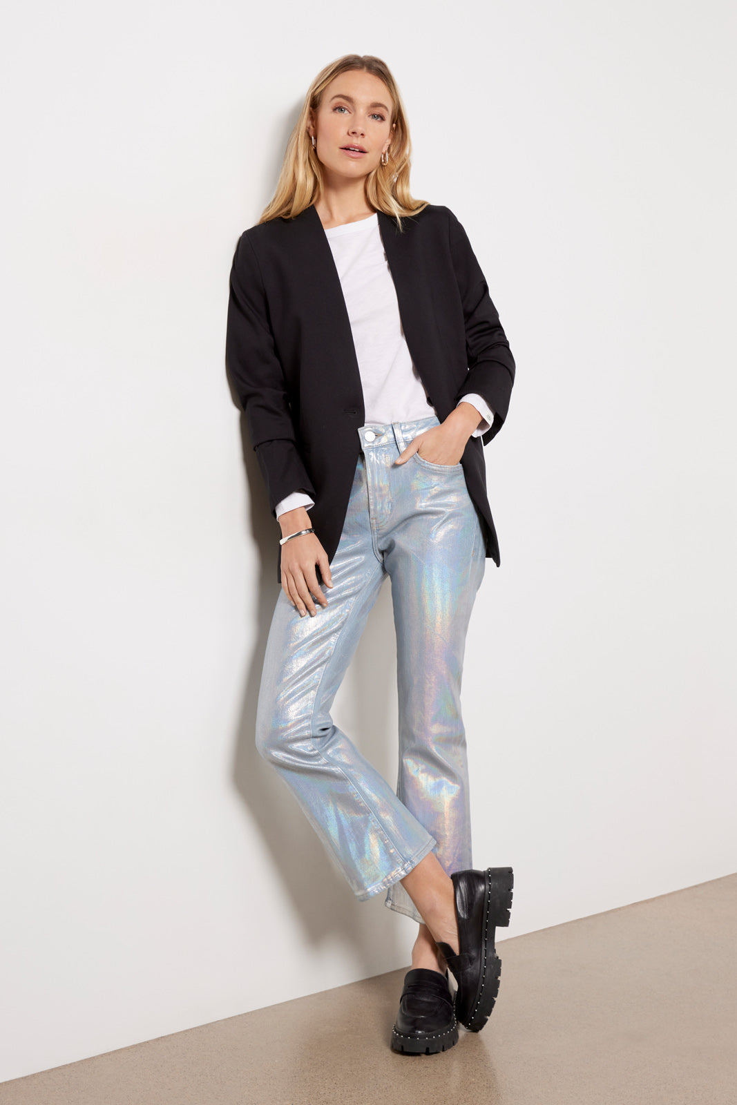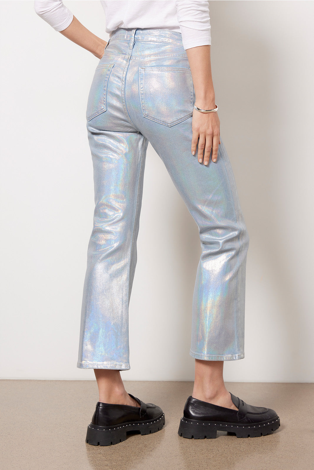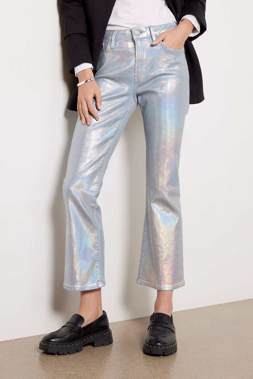 A chic way to make a statement, these bootcut jeans by FRAME are crafted in stretch denim with a fun holographic coating and feature a low-rise fit, gently flared leg, and ankle-length hems. Style with a blouse, bodysuit, or blazer for a party-ready look.