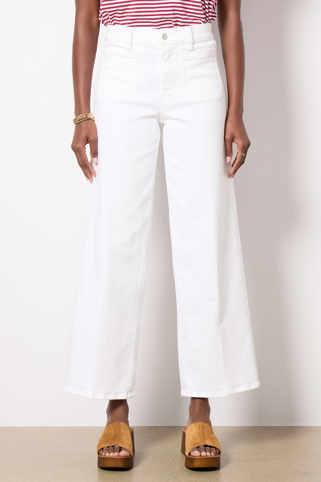 A wide leg jean that fits and flatters, the Le Slim Palazzo Jean by FRAME is crafted in soft stretch denim with a full-length inseam, crisp white wash, and patch pockets at the front and back.