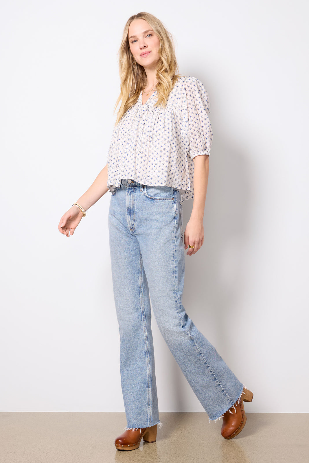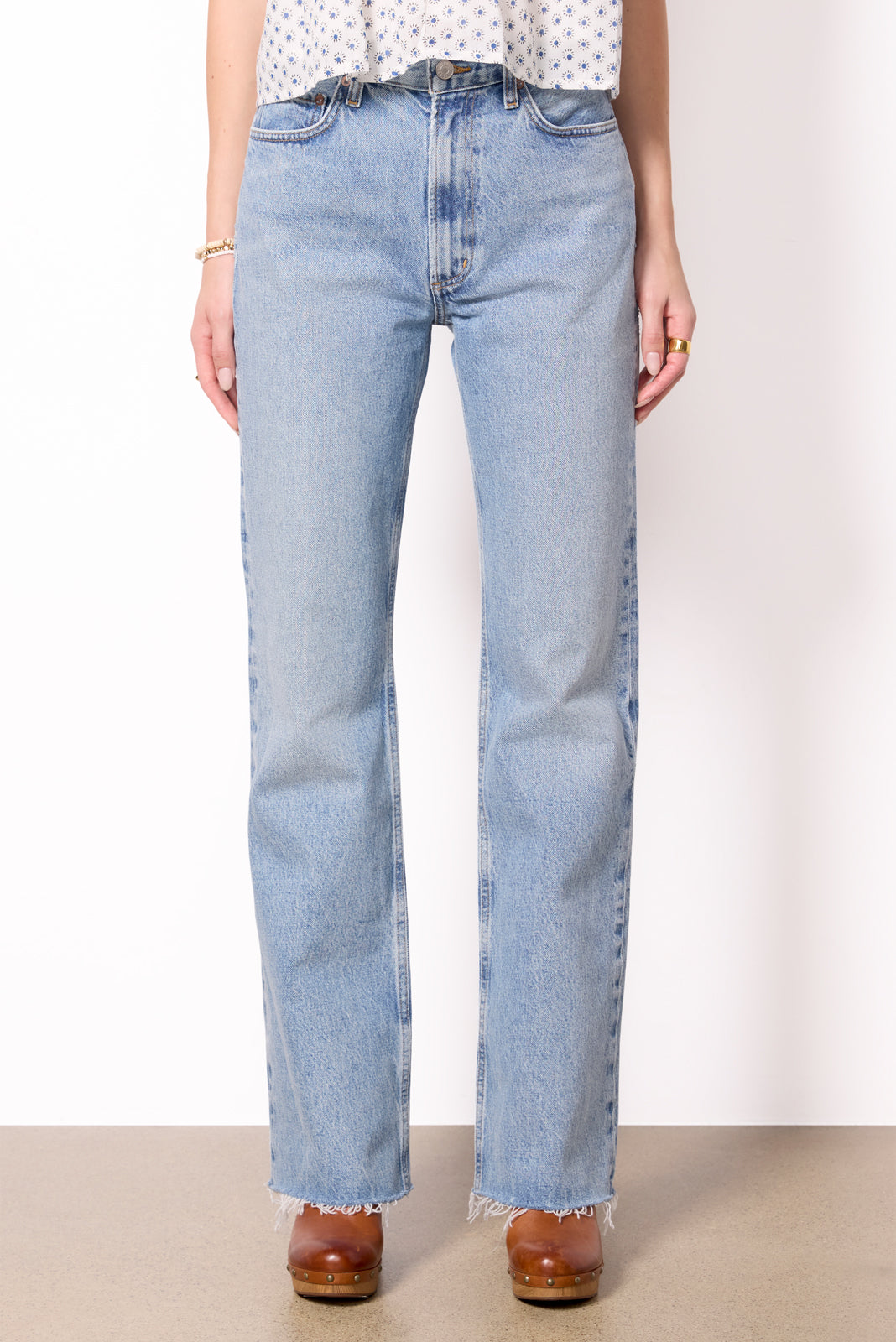 Rigid cotton denim and a high-rise fit add vintage appeal to these baby flare jeans by AGOLDE, featuring a full-length inseam, medium blue wash, and raw hems.