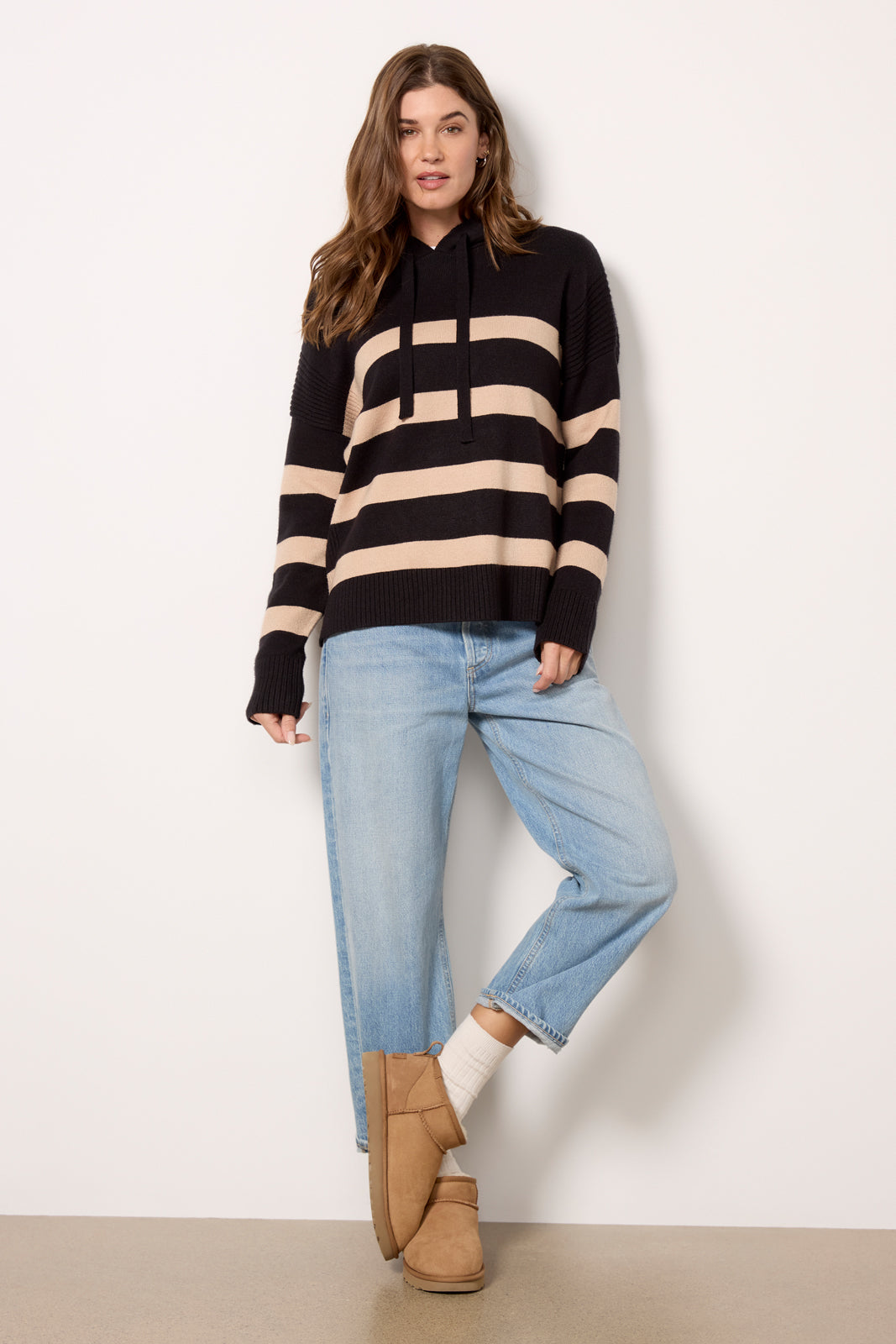 Stay cozy-chic in this striped sweater hoodie by EVEREVE. Finished with rib knit detailing, this easy-to-love sweater features an adjustable drawstring hood, relaxed fit, and dropped shoulders.