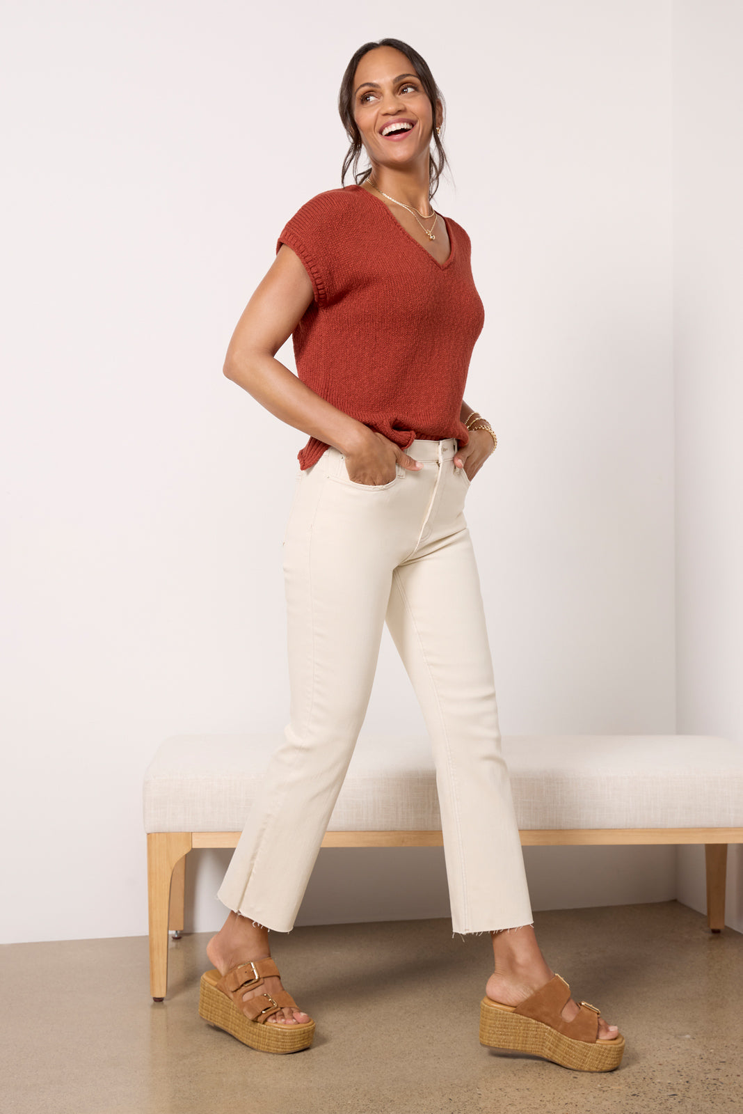 Crafted from soft stretch denim in an ecru wash, the Lennon jean by Pistola features a bootcut silhouette with a high-rise waist and ankle-length raw hems. Take them from day to night with a blouse, tee, or fitted tank.