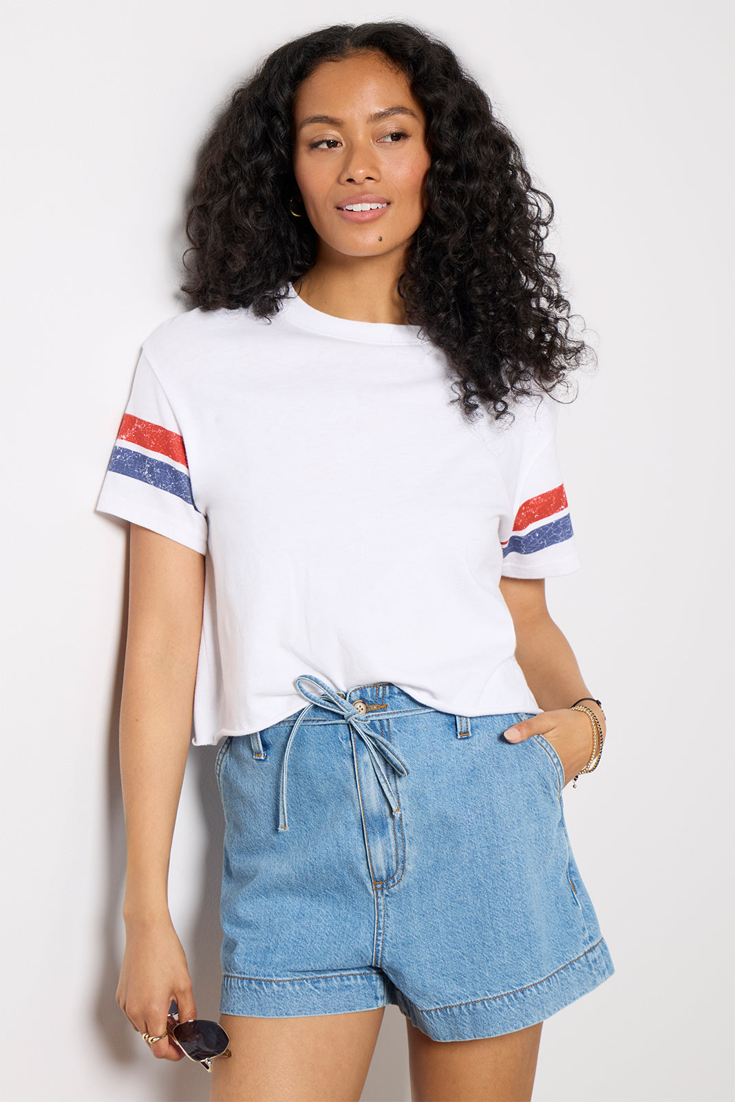 Add a sporty flair to your summer wardrobe with this varsity t-shirt by perfectwhitetee, finished in comfy cotton fabric with a cropped fit, raw edge hem, and striped short sleeves.