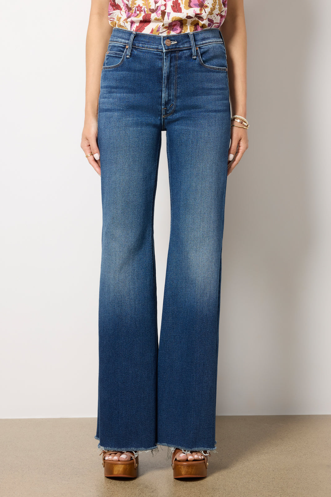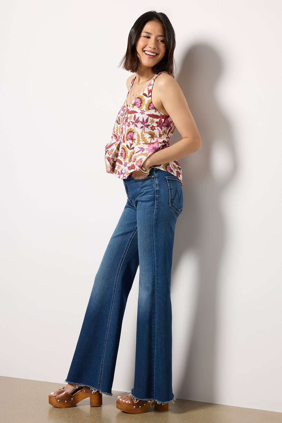 The Lil Doozy Fray jean by MOTHER is a petite flare silhouette, crafted in soft cotton-blend denim with a full-length 31" inseam, raw hems, and a faded blue wash. Designed to complement petite body types, these jeans feature a higher knee placement, shorter inseam, and shorter rise for a perfect, always-flattering fit.