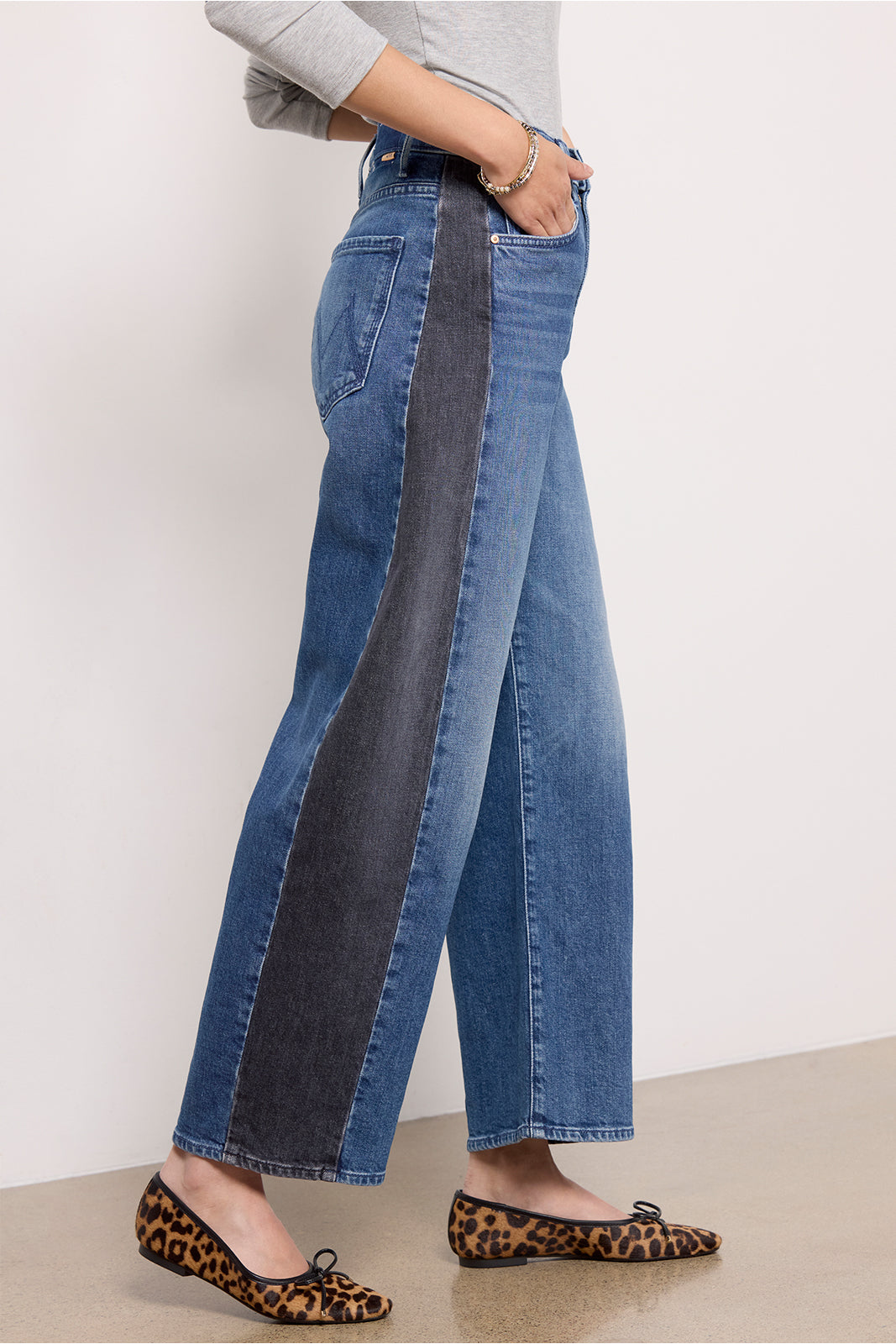 The Lil Half Pipe Flood by MOTHER is a petite barrel jean, featuring a high-rise fit, curved leg, and faded black panels down the sides. Designed to complement petite body types, these jeans feature a higher knee placement, shorter inseam, and shorter rise for a perfect, always-flattering fit.