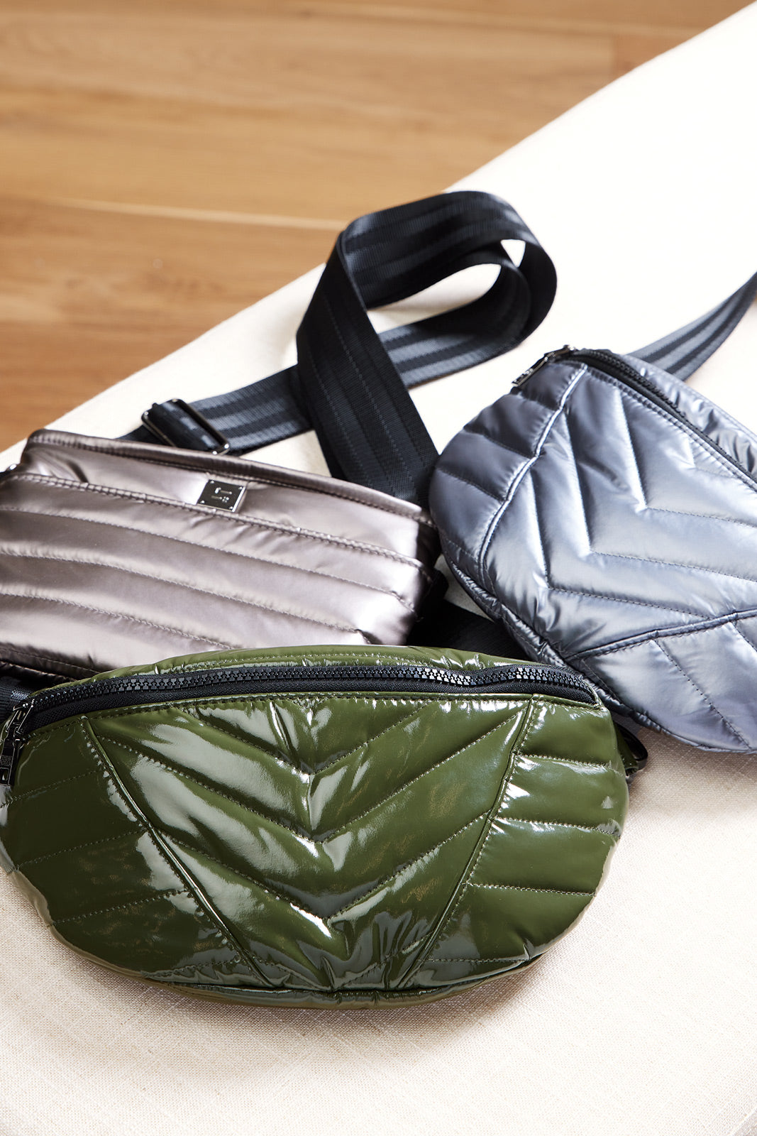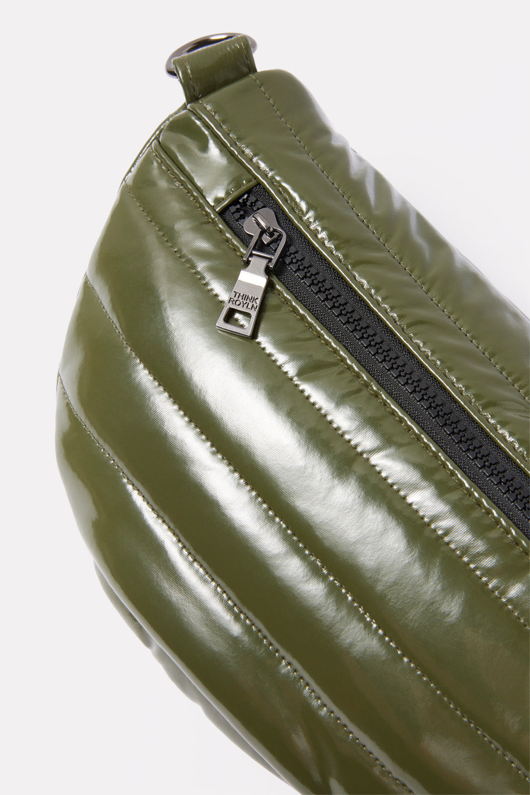 Finished in olive patent fabric, the Little Runaway bag by Think Royln features a chic quilted design with a front zipper closure, back zipper pocket, and two adjustable, detachable crossbody straps.