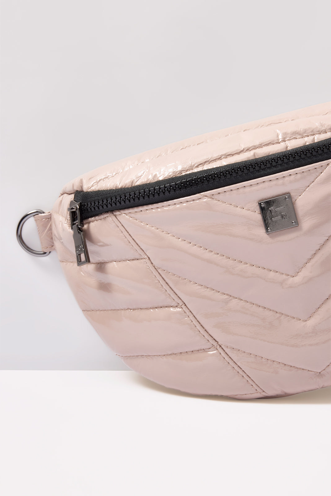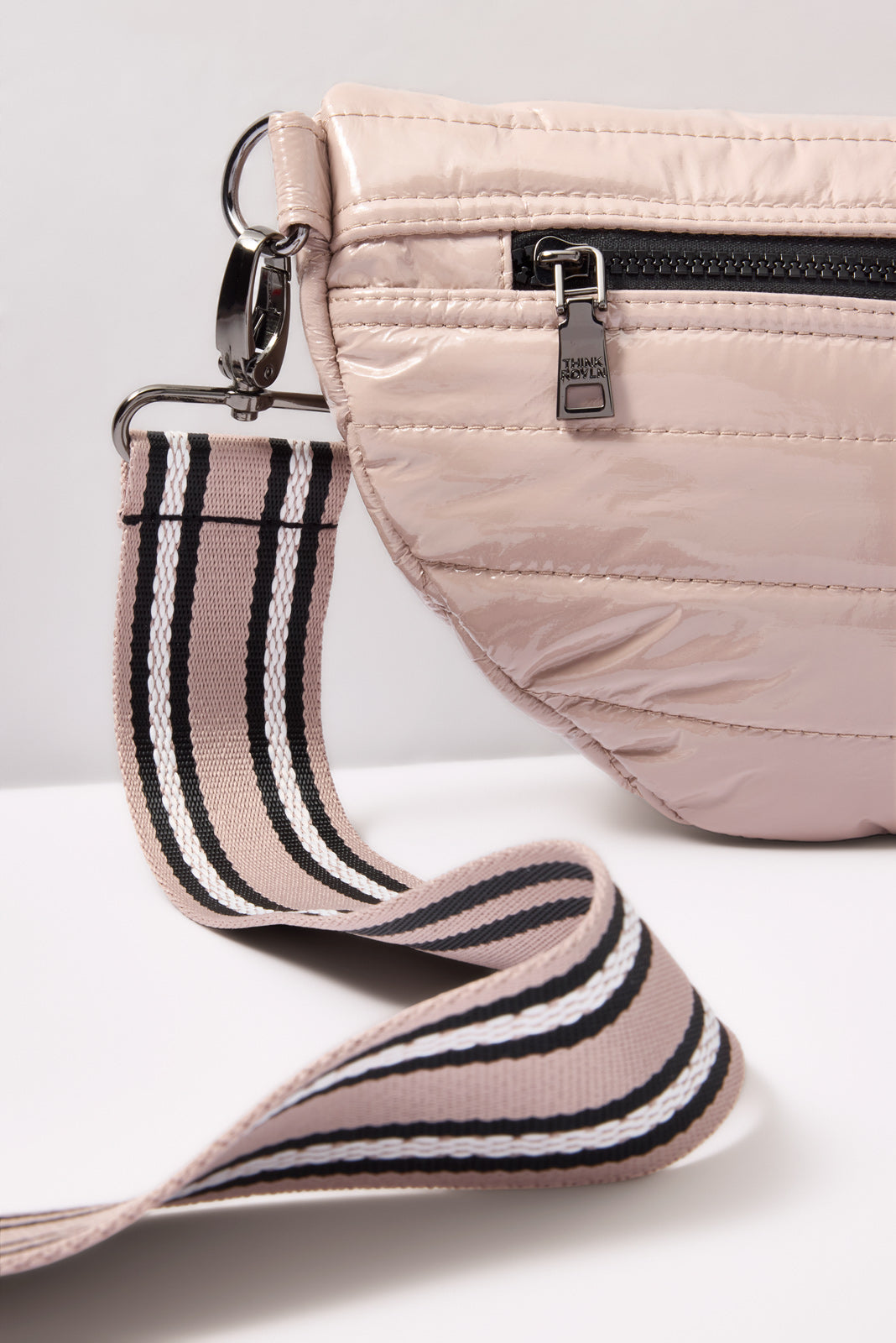 The Little Runaway bag by Think Royln features a chic quilted design with a front zipper closure, back zipper pocket, and two adjustable, detachable crossbody straps.