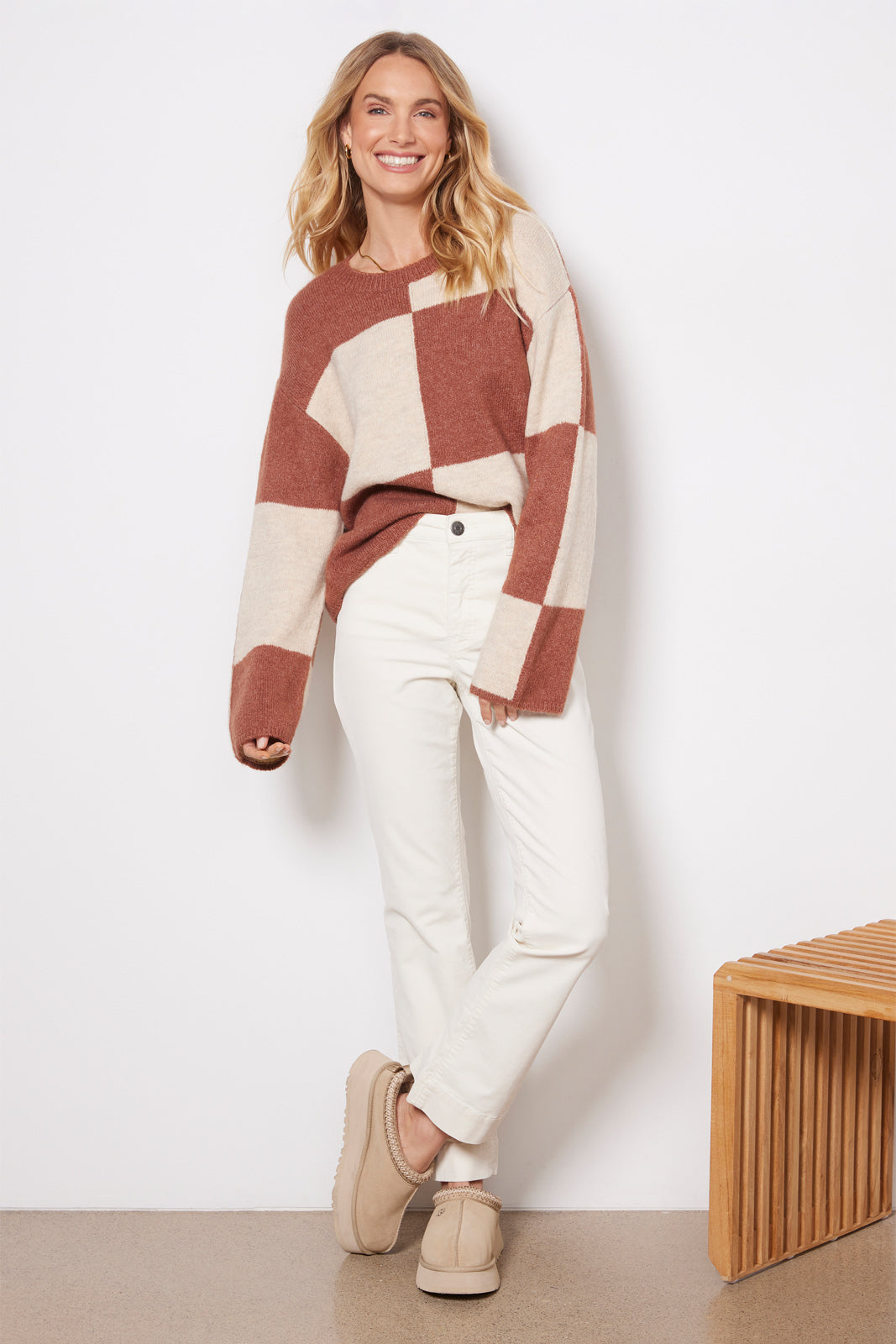 This cream and copper checkered sweater by Z Supply is the ultimate cozy pullover for fall. Made using chunky sweater yarns, this sweater features roomy long sleeves and an easy, relaxed fit that hits at the waist.
