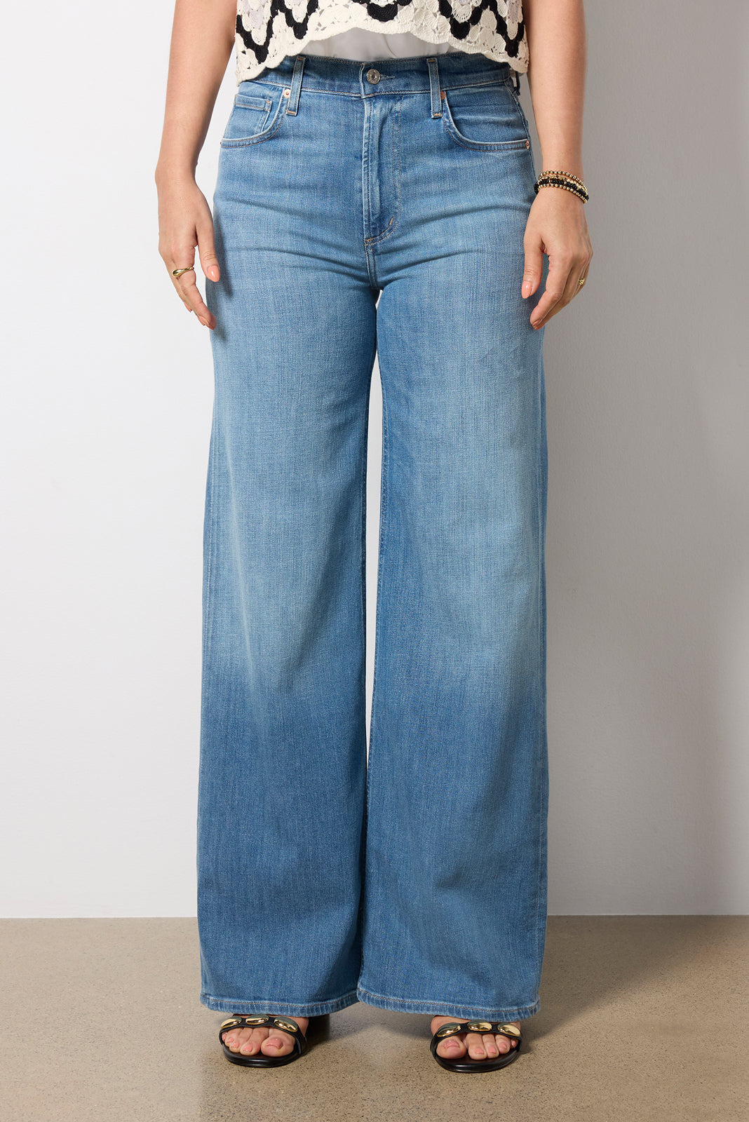 A relaxed fit and longer inseam define these stylish wide-leg jeans by Citizens of Humanity. Crafted in soft cotton-blend denim, the Lyra jean features a high-rise waist, light blue wash, and full-length clean hems.