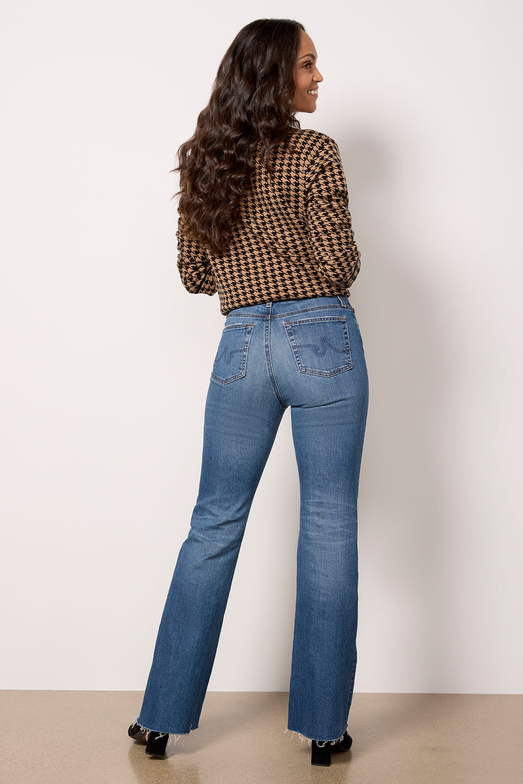 Dressed up or down, these high-rise flares by AG are the perfect addition to your denim collection, designed with a full-length inseam, faded blue wash, and raw hems.