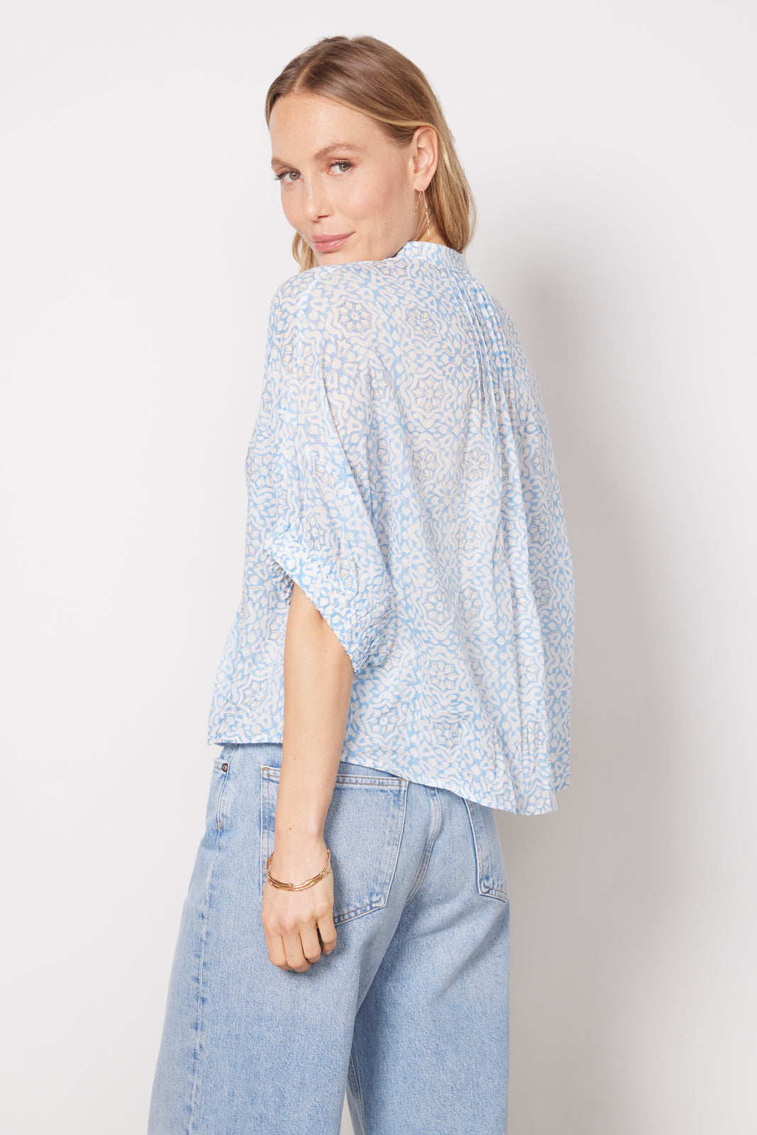 Crafted in organic cotton fabric, this button-front blouse by Emerson Fry features a mandarin collar, elbow-length puff sleeves, and pleated yoke detailing. This spring-ready top is finished in a flowy fit for an easy, effortless feel—perfect for dressing up or down.