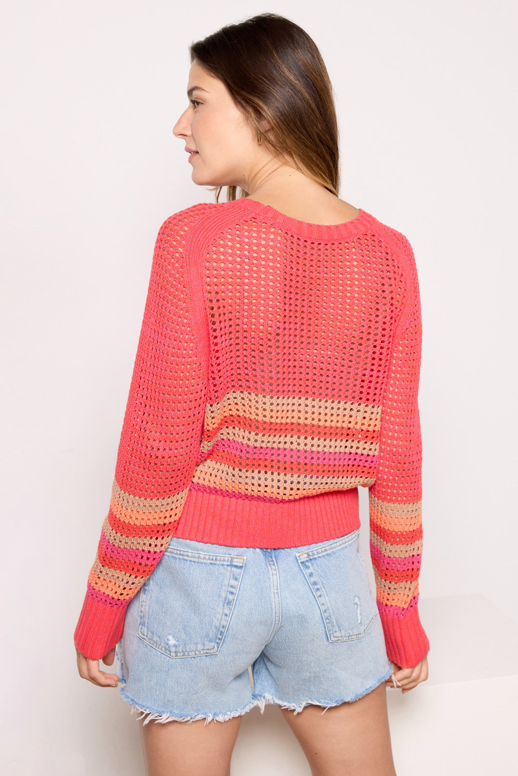 Crafted in airy open-knit cotton, this beachy striped sweater by 525 features a relaxed silhouette, cropped length, and rib knit trim at the collar, cuffs, and hem. Layer with a cami and tuck into your favorite cutoffs for a chic summer look.