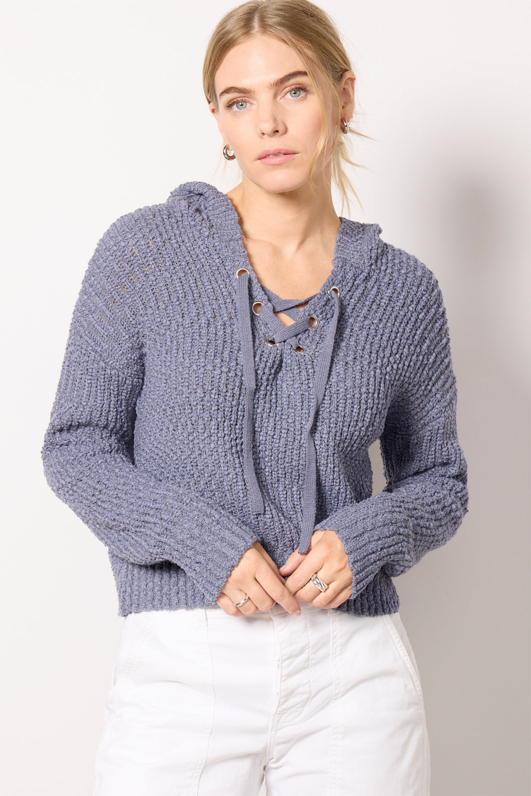 Add effortless style to your spring wardrobe with the Marina sweater hoodie by Design History. Finished in a textured knit, this hooded pullover features a cropped length, lace-up neckline, and long sleeves with dropped shoulders.
