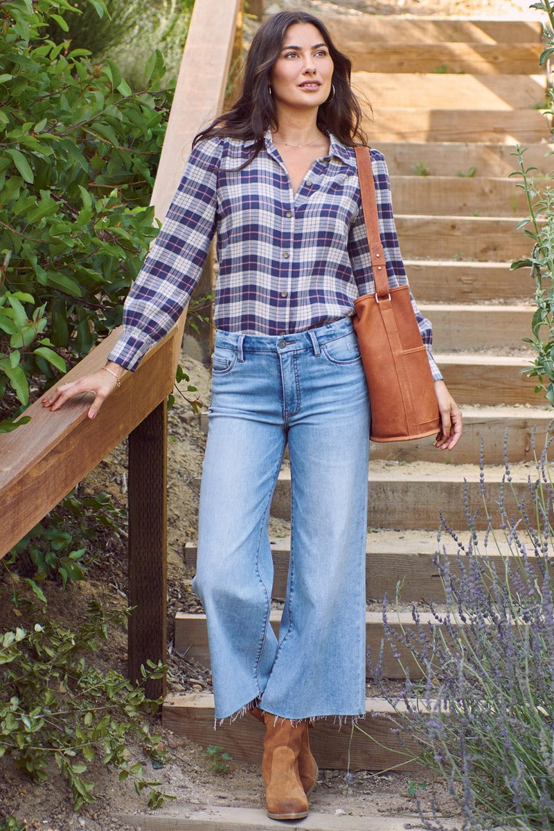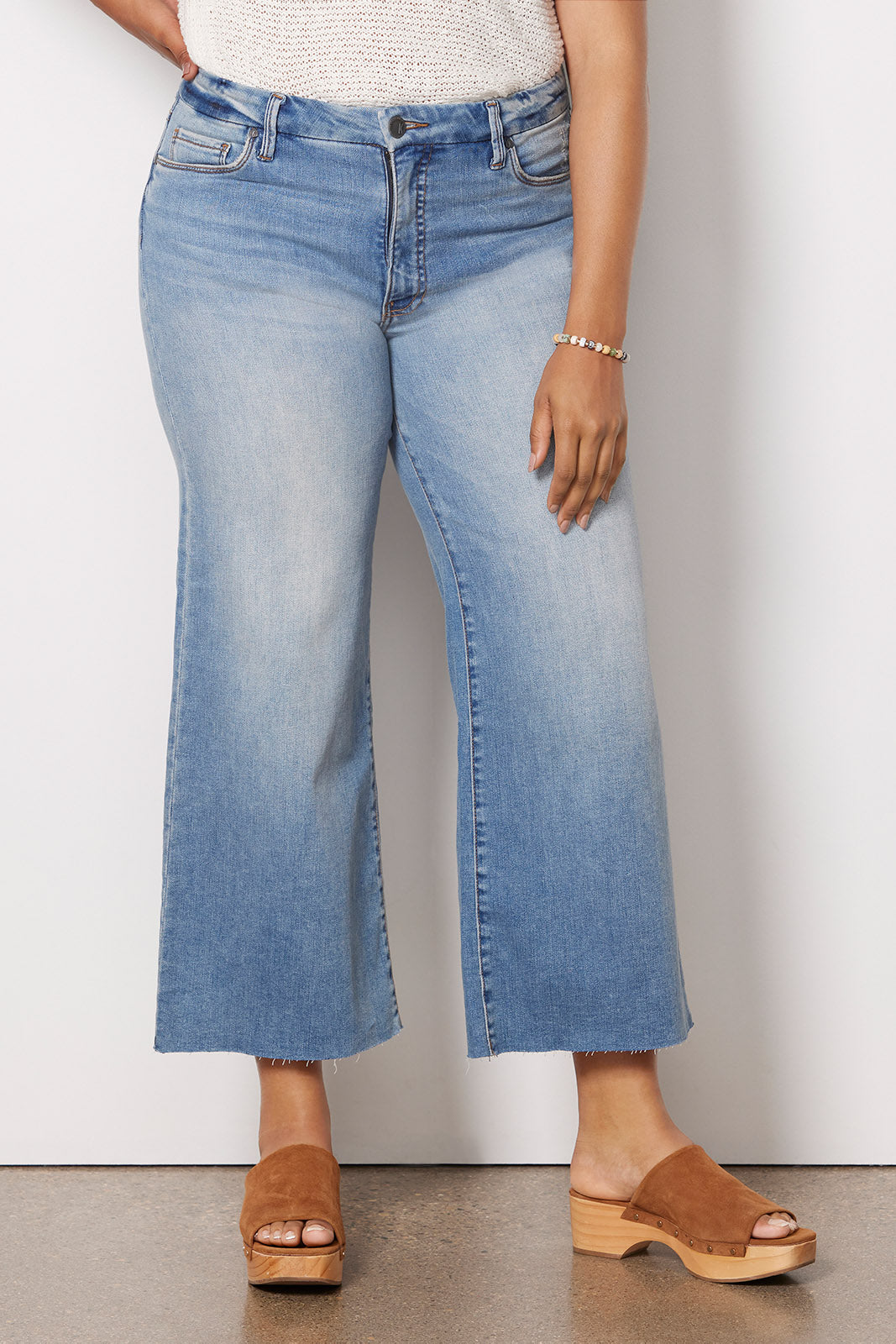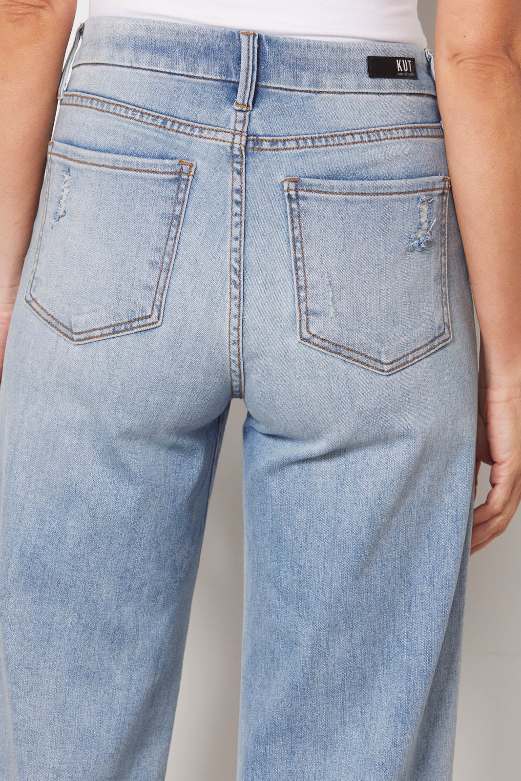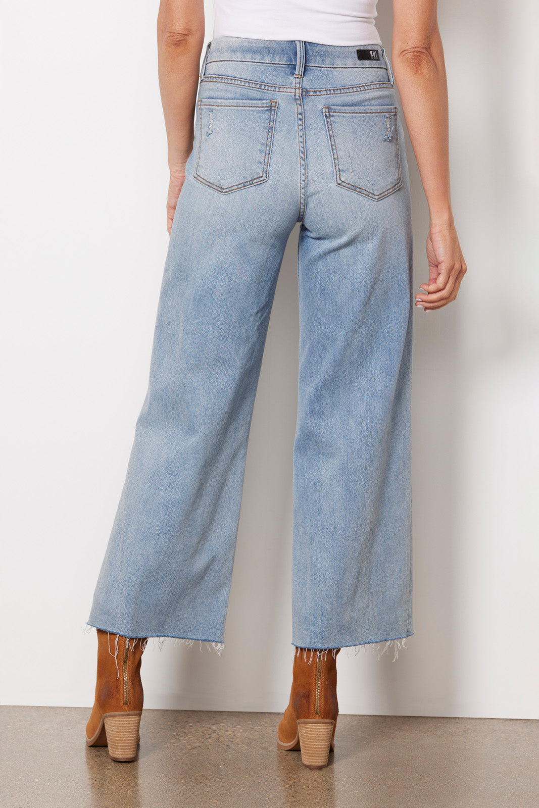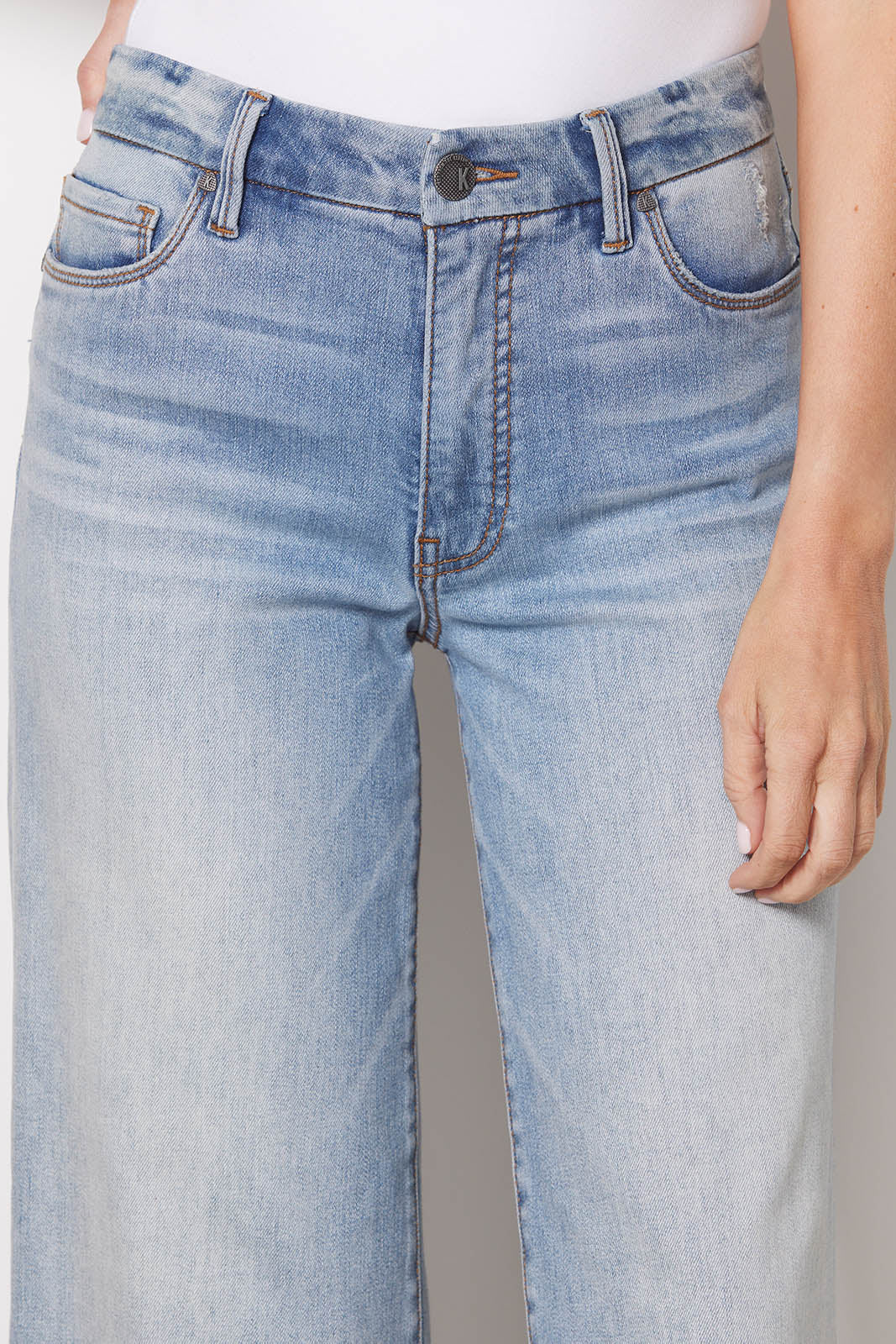 Update your denim collection with this wide leg silhouette by Kut From The Kloth. Finished in a perfectly faded wash with a distressed pocket detail, these high-rise jeans feature ankle-length raw hems that look equally chic with sandals or sneakers.