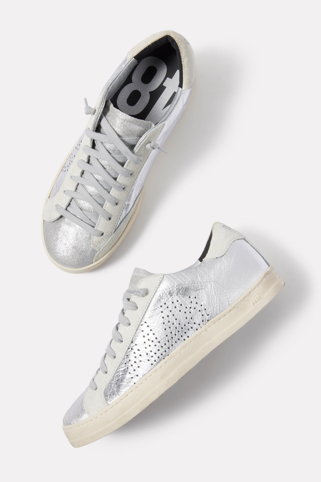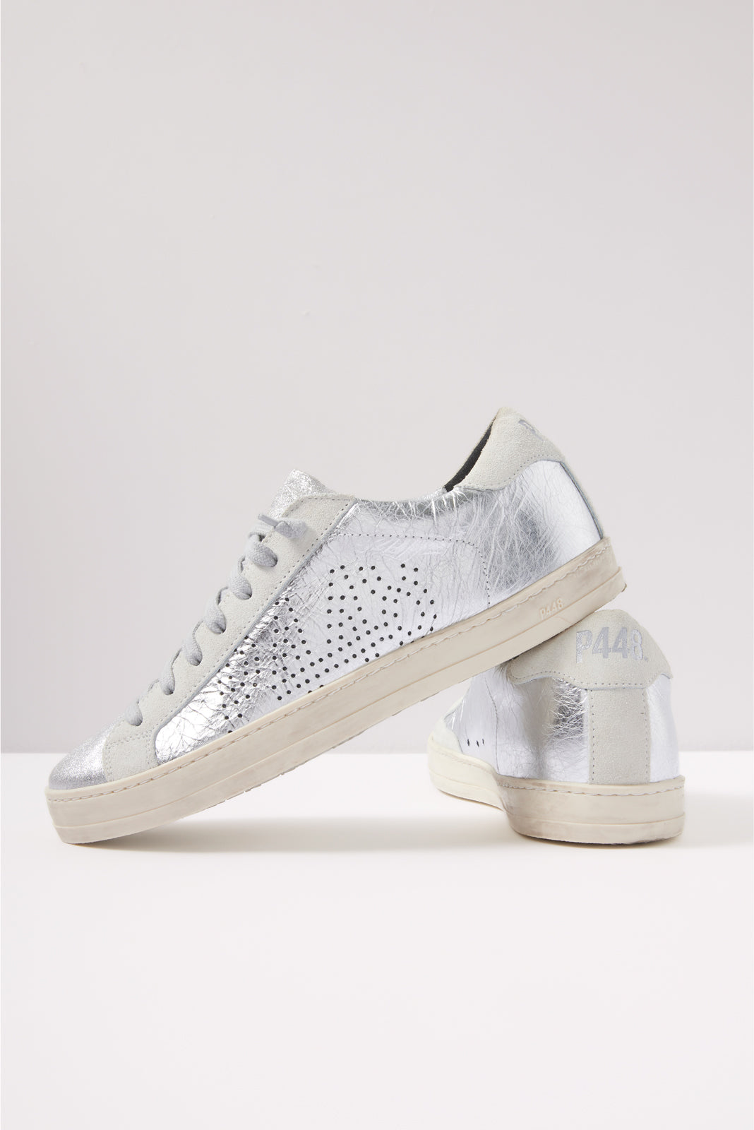 The Metallic John Sneaker by P448 is crafted with a silver leather upper and finished with a distressed rubber sole. The metallic side paneling, toe, and tongue add eye-catching detail to these perfect every day sneakers.