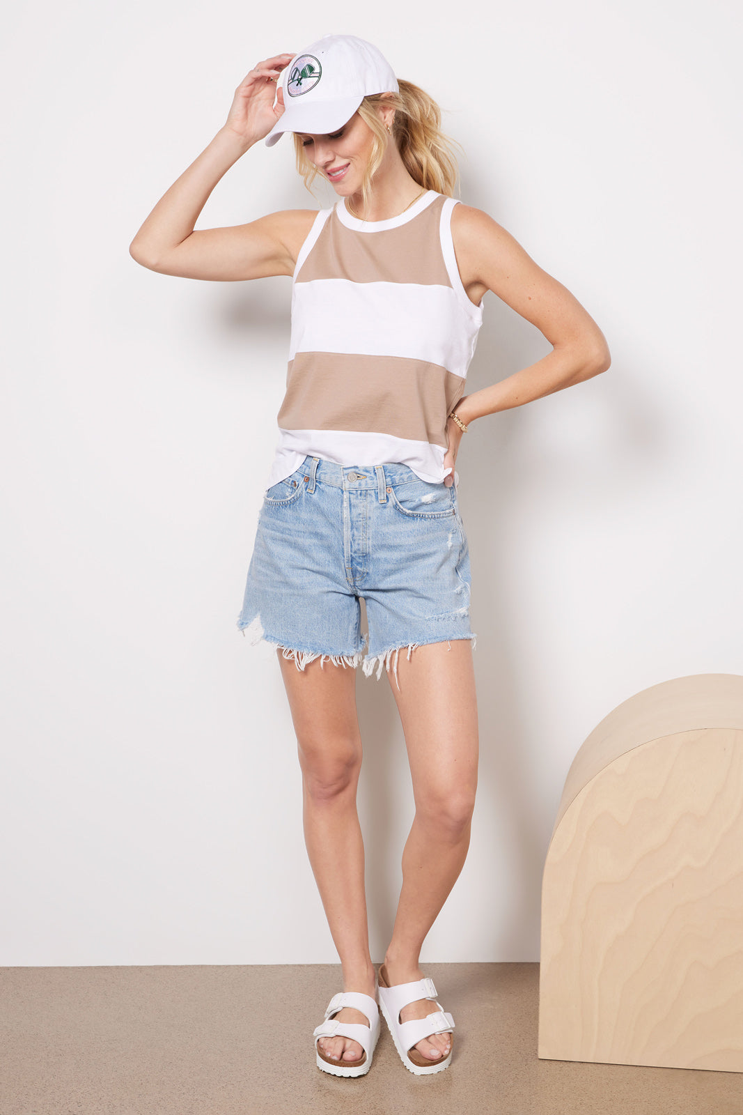 A colorblocked stripe design lends a sporty-chic feel to this EVEREVE tank crafted in soft Pima cotton fabric with a crew neckline and ribbed trim. Add it to your everyday rotation with denim, utility pants, or a skort.