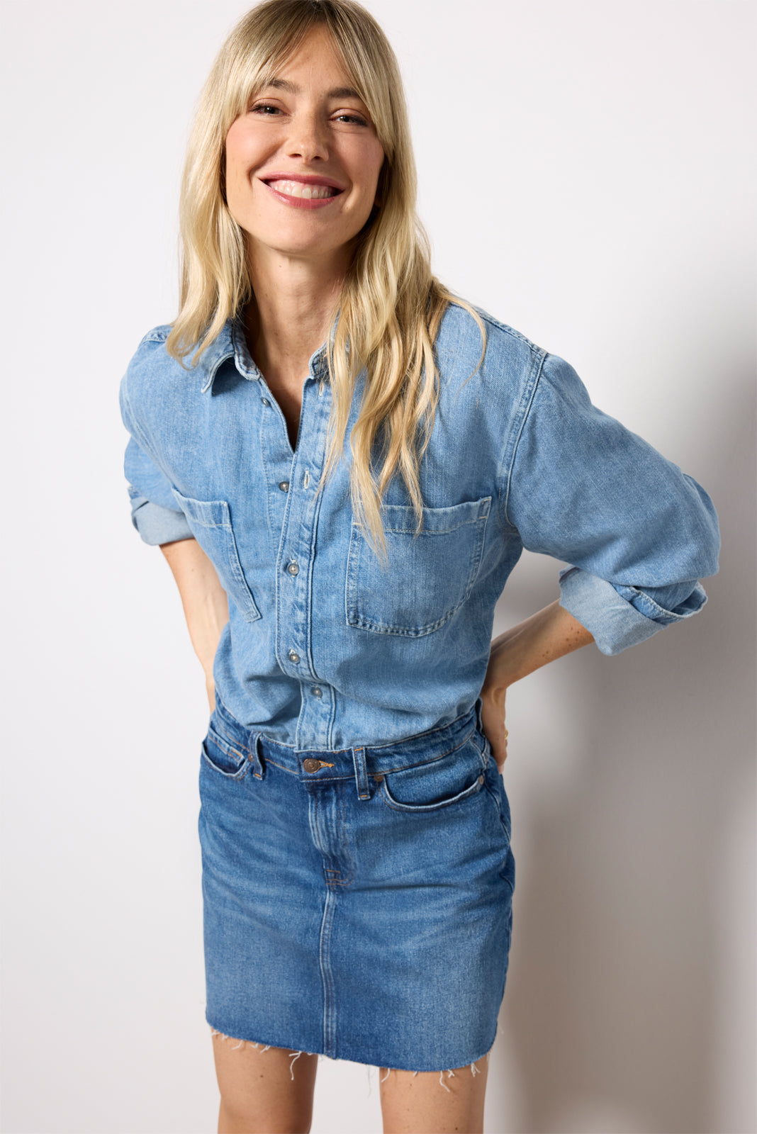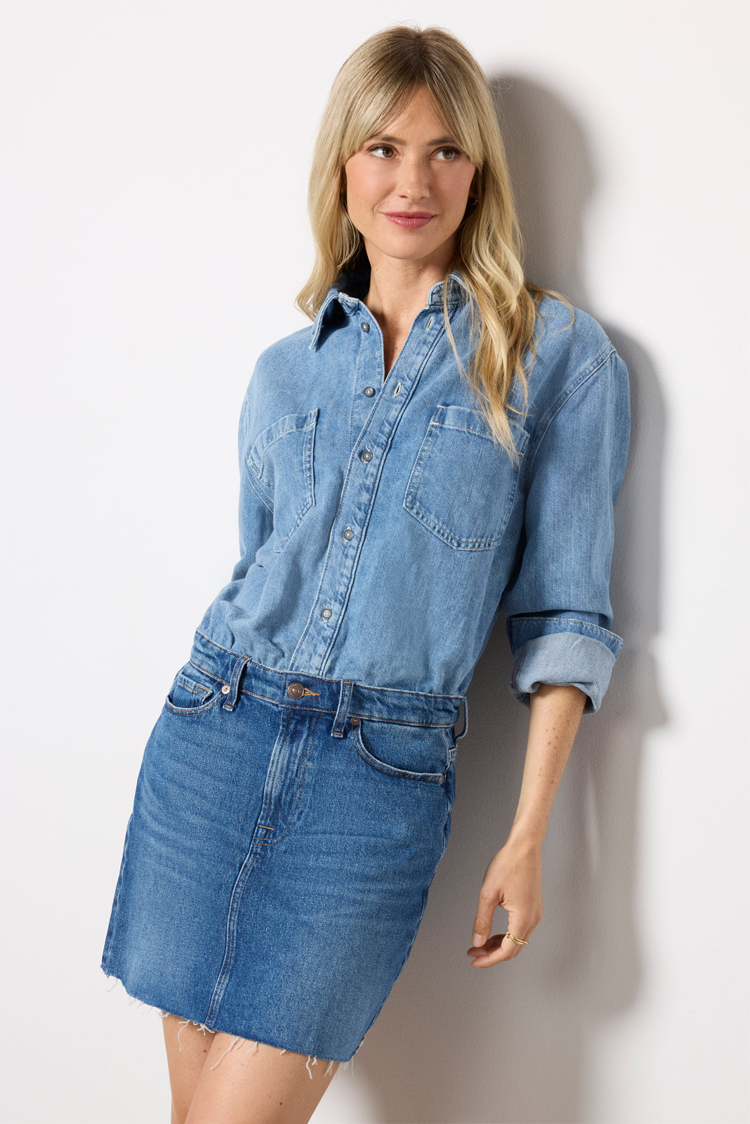 The Mini Skirt Dress by 7 For All Mankind is perfect for an all-in-one denim look, featuring a raw-hem mini skirt and an attached button-down top with pockets at the chest.