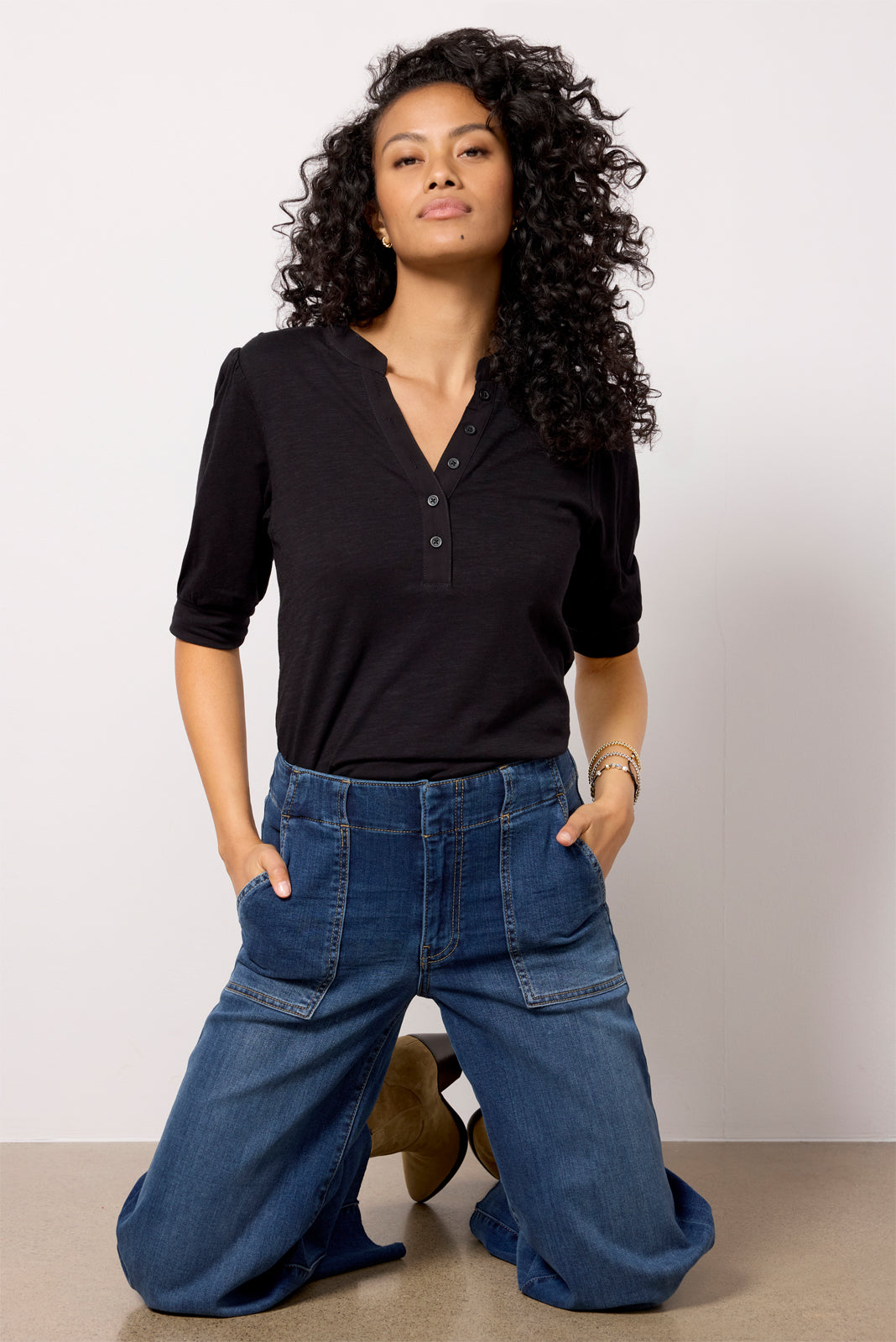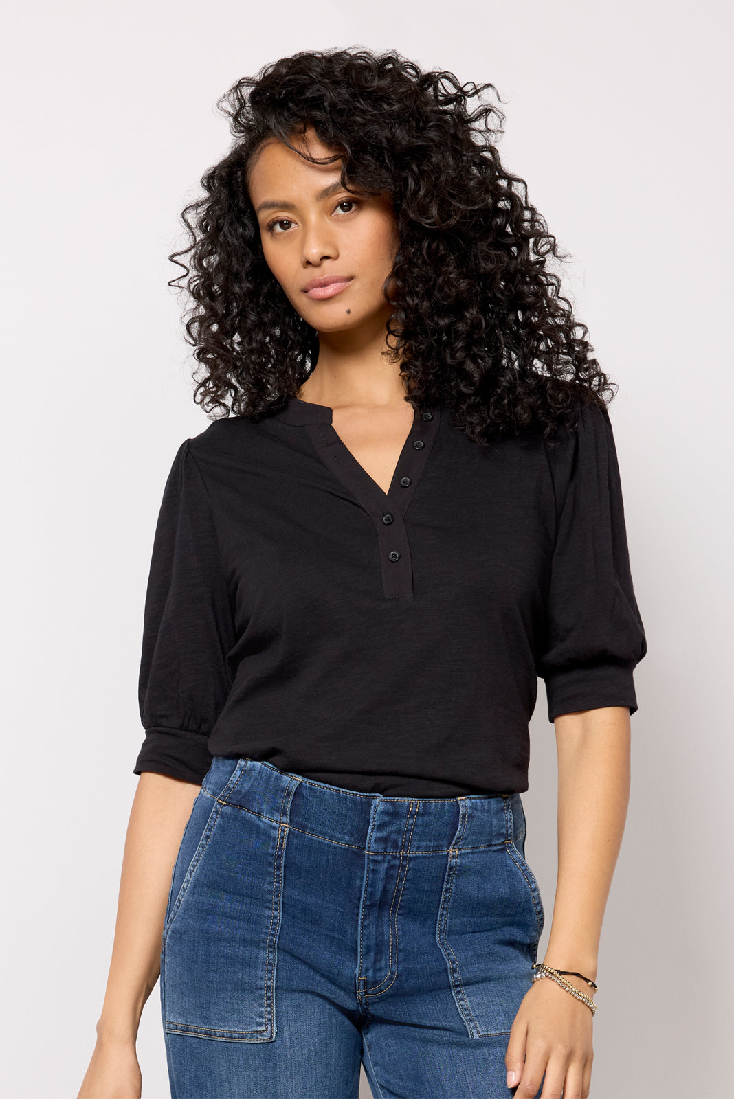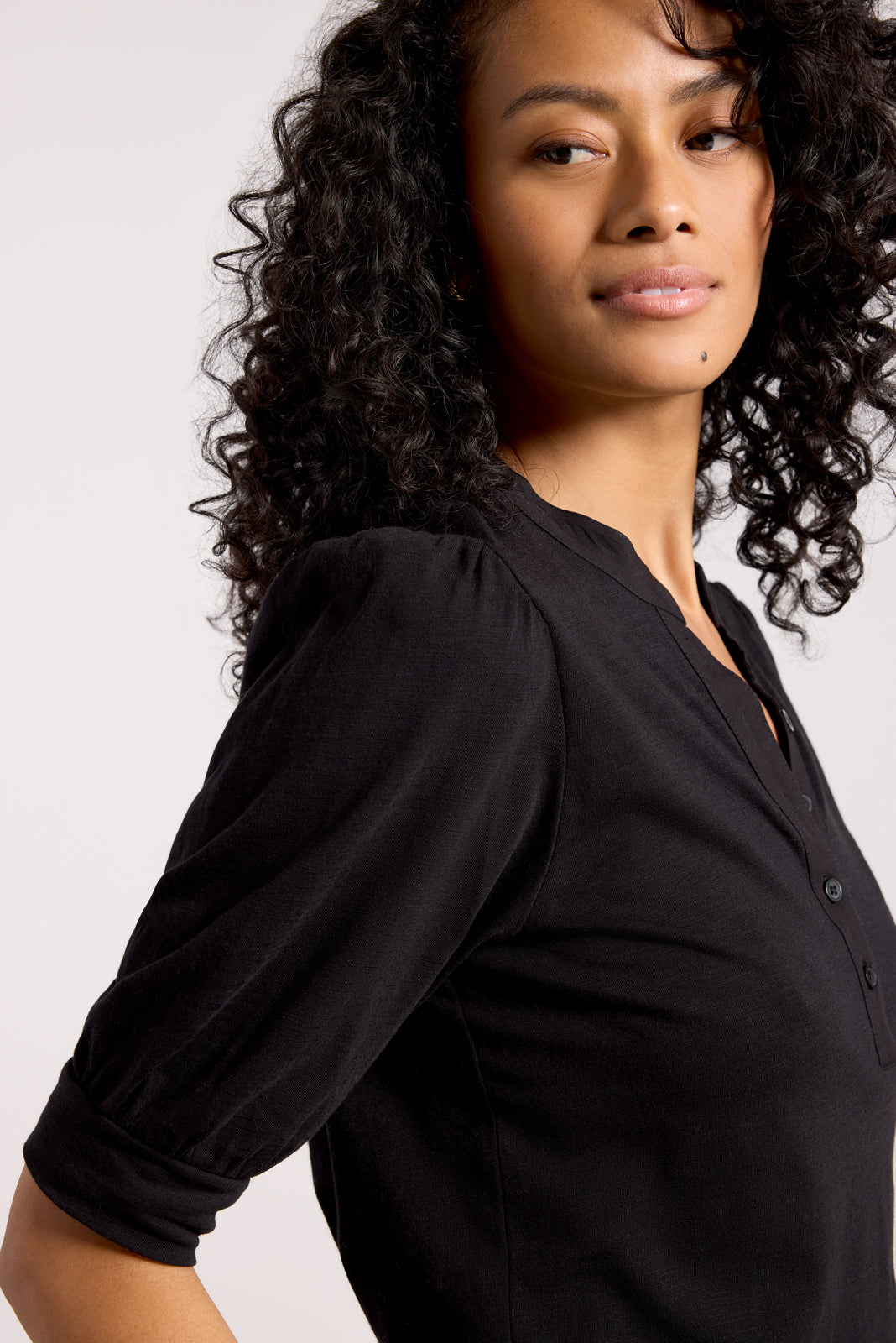 The Mixed Media Tee is the perfect layering piece for all your outfits, featuring half placket button closures, three-quarter sleeves, and a relaxed fit.
