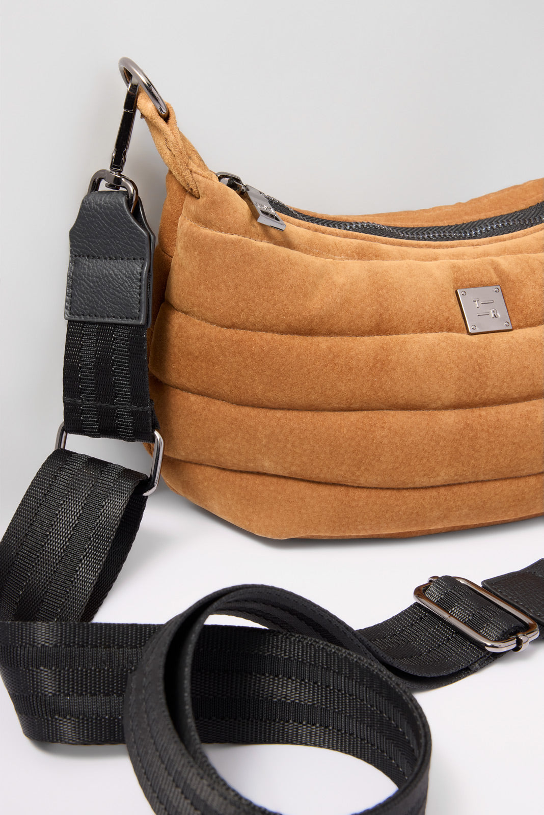 Crafted in soft, luxe suede, the Moon Goddess Bag by Think Royln features a top zip closure and two detachable strap options—a metal chain strap to wear on the shoulder or an adjustable crossbody strap to go hands-free.