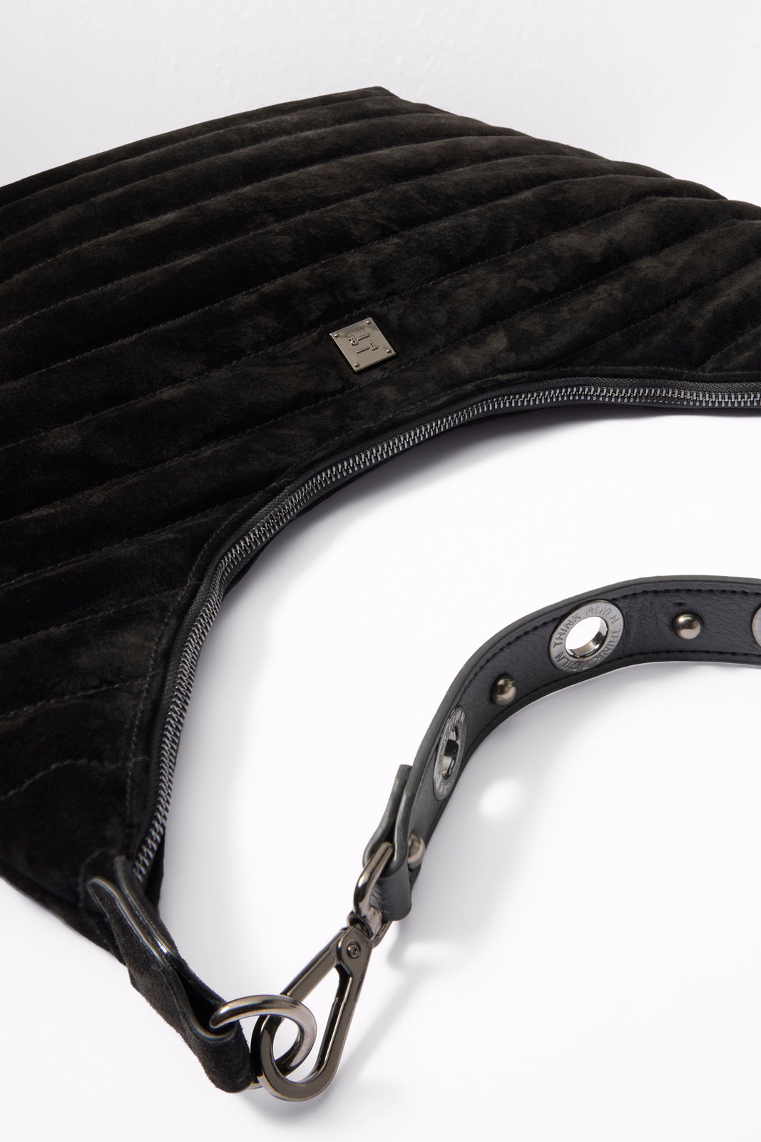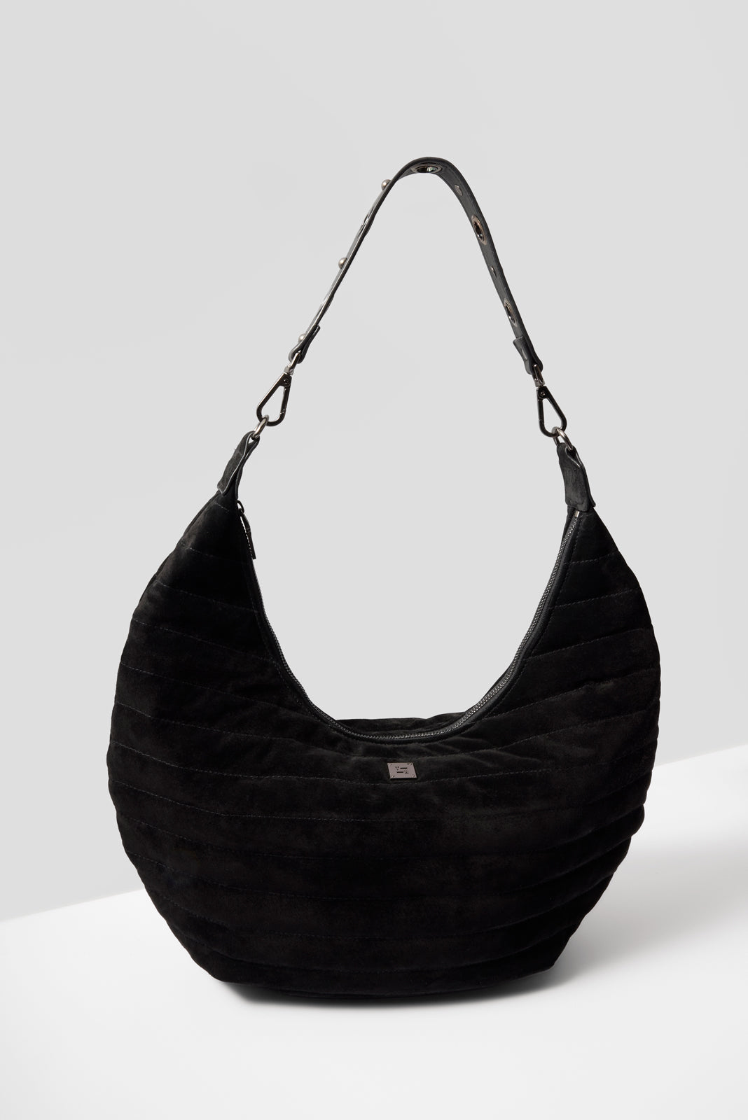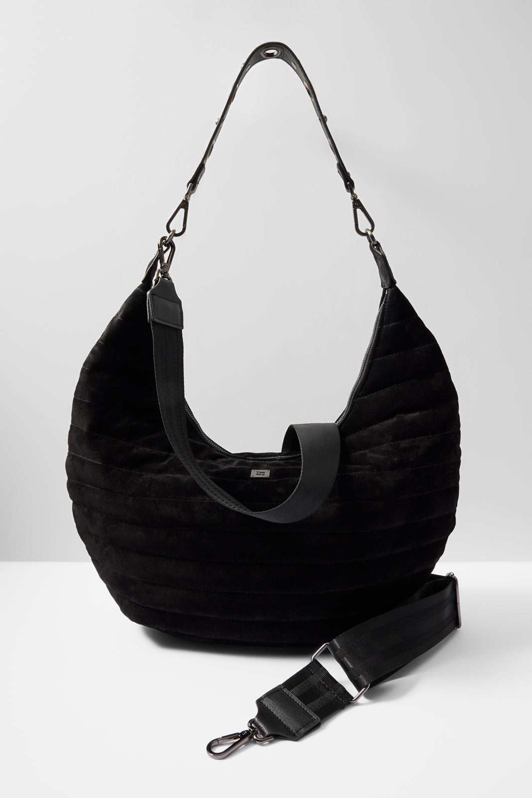 Soft black suede makes the Moonstruck Hobo Bag by Think Royln the perfect night out accessory, featuring a top zip closure and two detachable strap options—a grommet strap to wear on the shoulder or an adjustable crossbody strap to go hands-free.