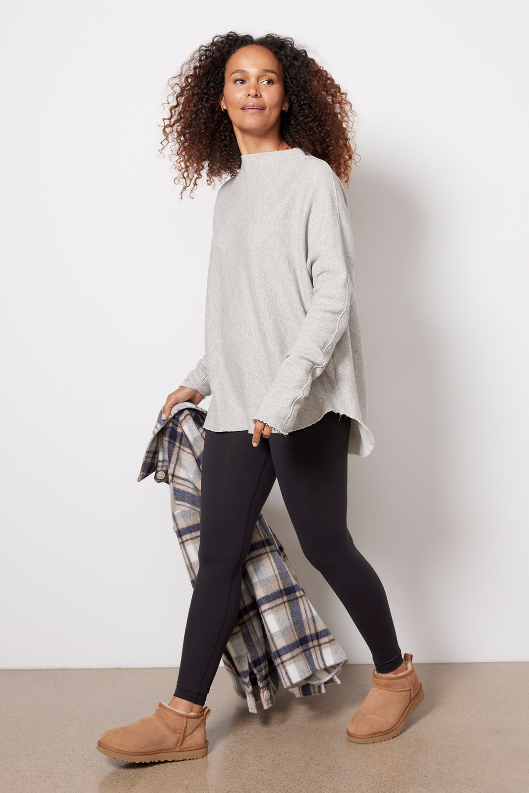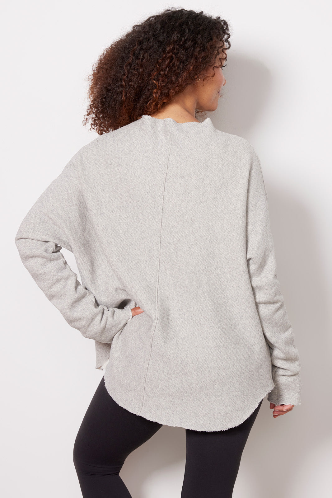 Complete any comfy-chic look with this easy-to-love sweatshirt by perfectwhitetee. Crafted in heathered French terry fabric, this relaxed pullover features a mock neckline, raw cut edges, and a longer length that pairs well with leggings or jeans.