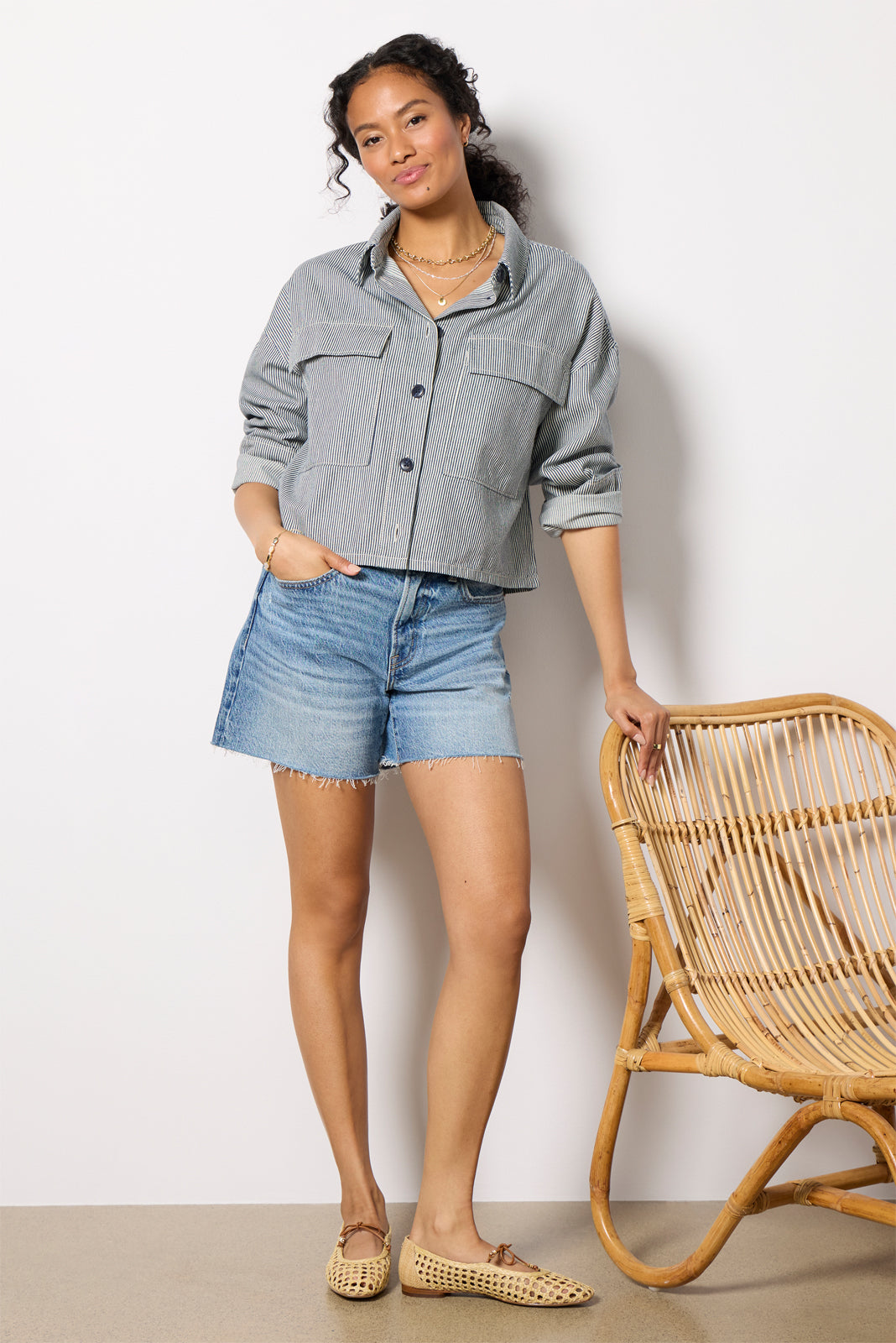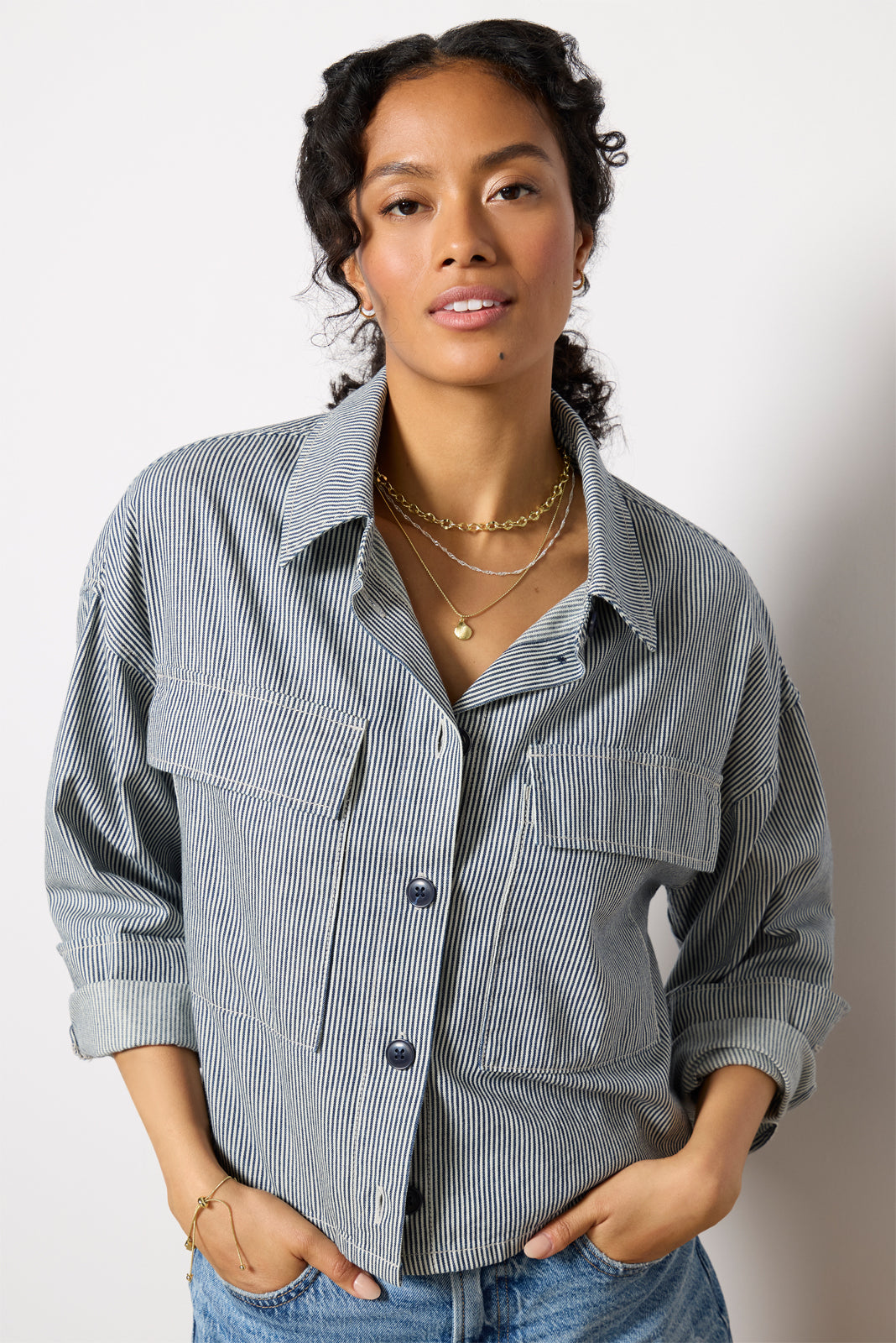 Perfect for wearing alone or layered, this Sanctuary shirt jacket is finished in coastal-style stripes and features a cropped silhouette with front button closures and chest flap pockets.