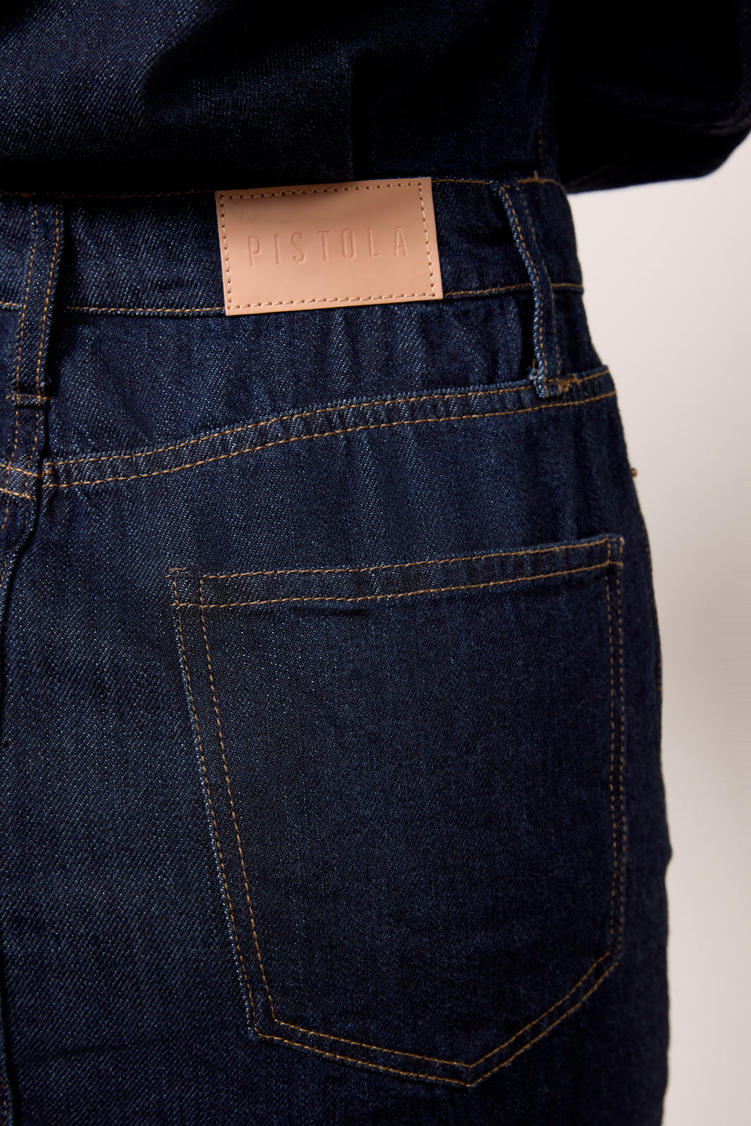 This denim dress by Pistola is perfect for your summer-to-fall rotation. Crafted from non-stretch cotton in a deep blue wash, the Nina Dress features a mini silhouette with a snap-front bodice, chest flap pockets, and belt loops at the waist.