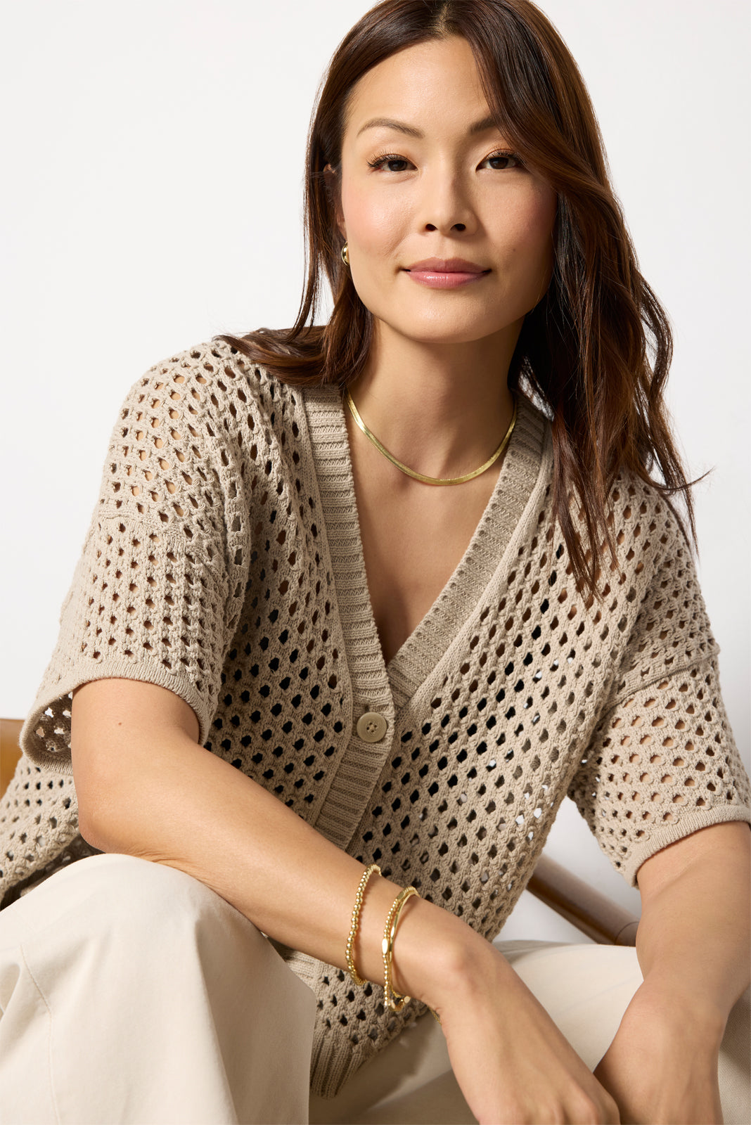 Update your spring wardrobe with the Nina Pointelle Cardigan by Splendid. Crafted in a cotton open-knit fabric, this easy layer features a v-neckline, button front closures, and cropped silhouette.