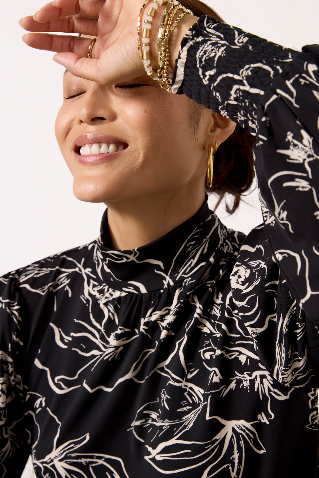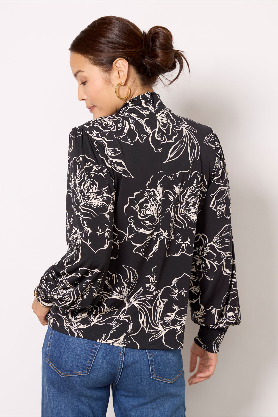 A fun abstract print elevates this chic mockneck top by Sanctuary. Crafted in slinky knit fabric, this relaxed silhouette features a back zipper closure, long puff sleeves, and half-elastic cuffs.