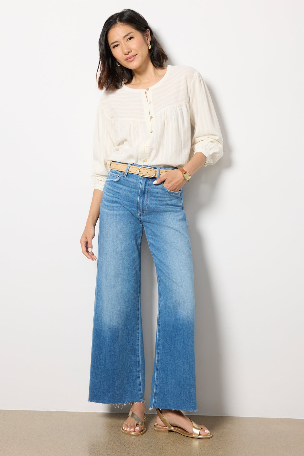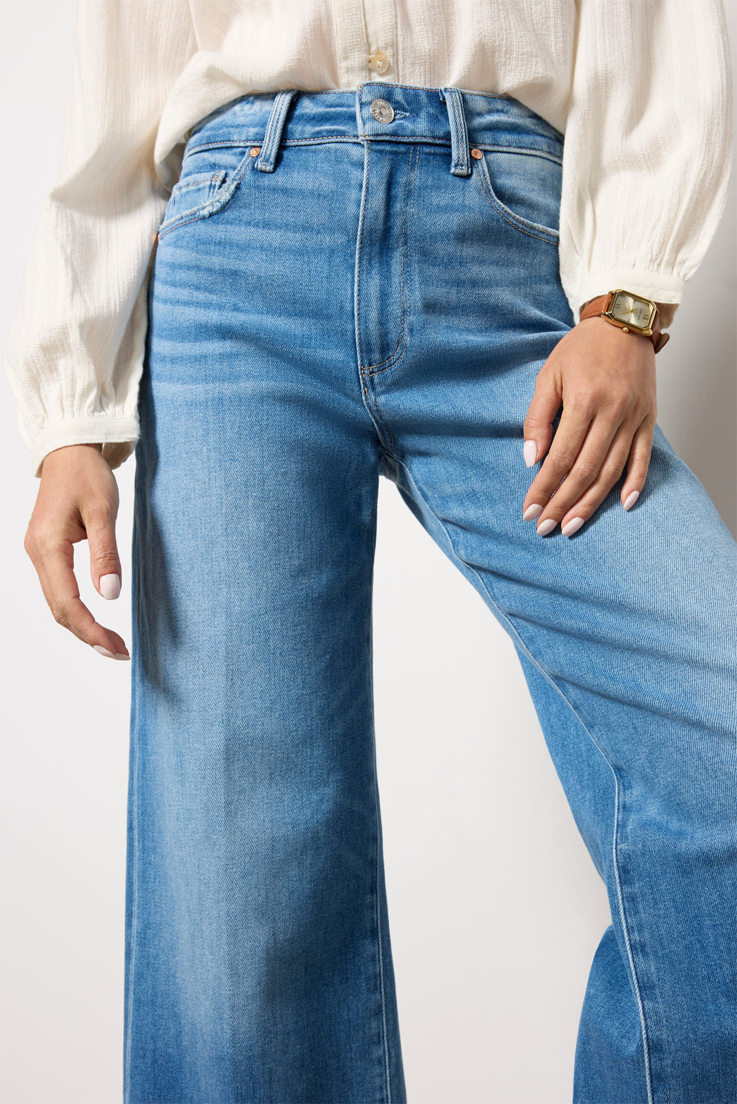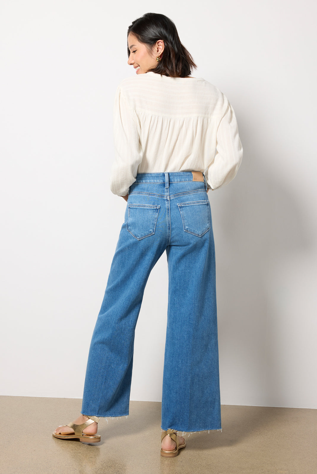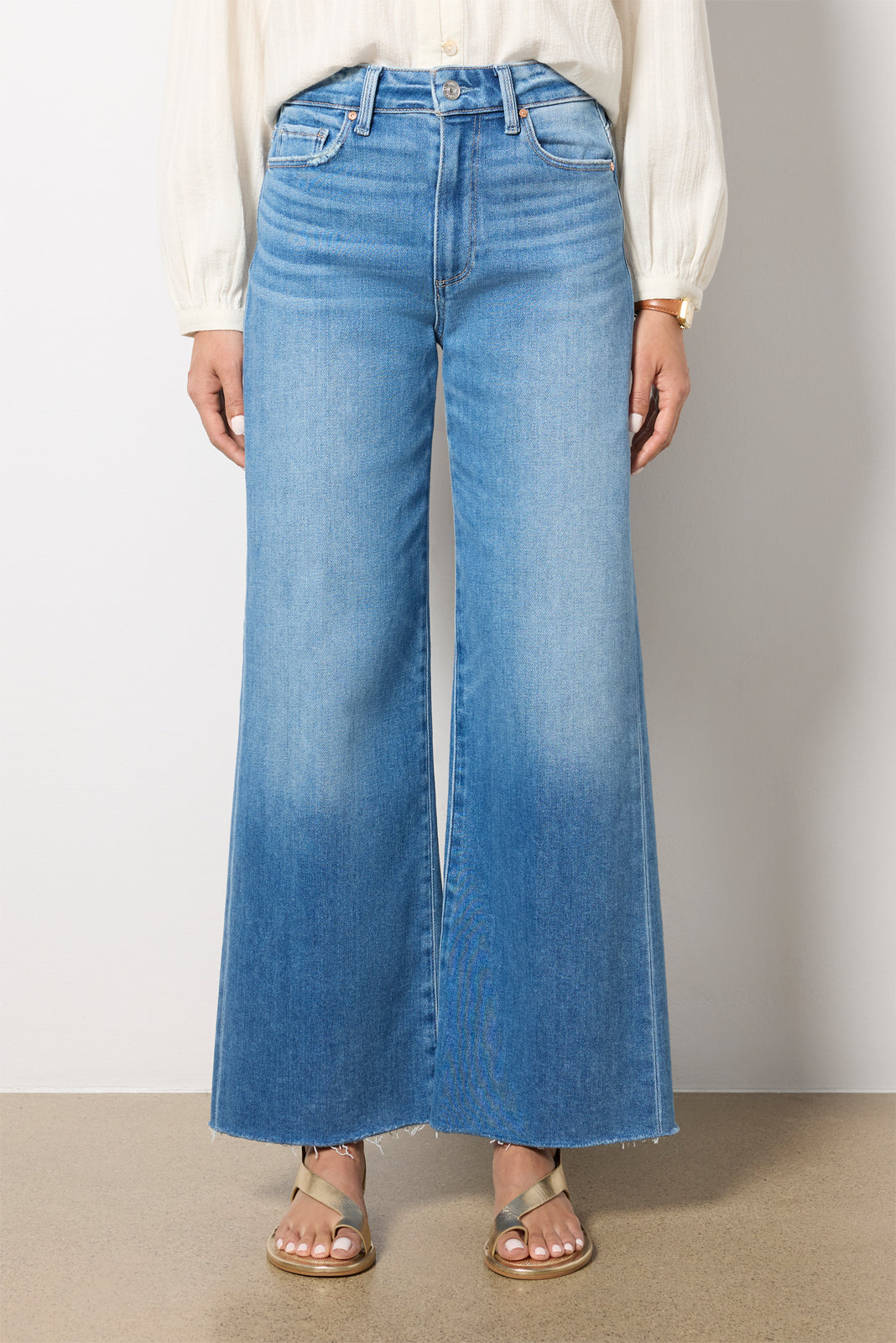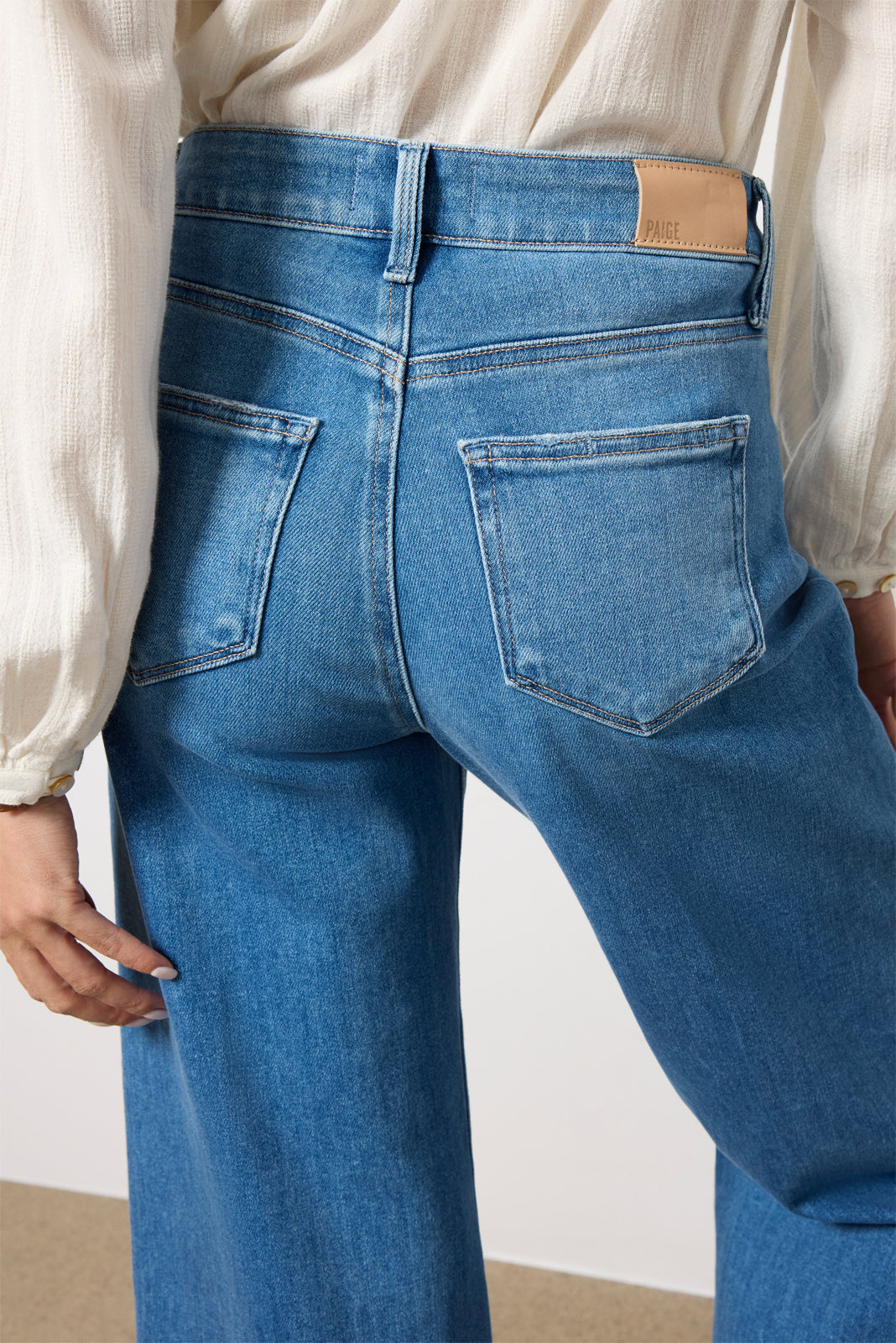 The wide leg jean you’ll be wearing on repeat. Designed with a 29" inseam and higher knee and mid-thigh placements, these petite Paige jeans are crafted in soft stretch denim with a flattering high-rise fit, medium blue wash, and full-length raw hems.