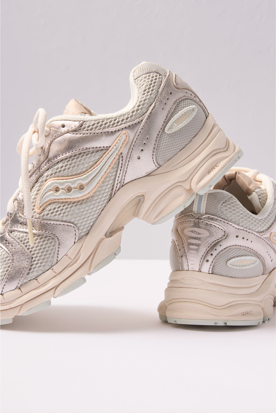 Metallic leather and an iconic 2000s-inspired design define the ProGrid Triumph 4 sneaker by Saucony, featuring a mesh upper, lace-up closure, and ProGrid technology outsole for workout-to-weekend comfort.