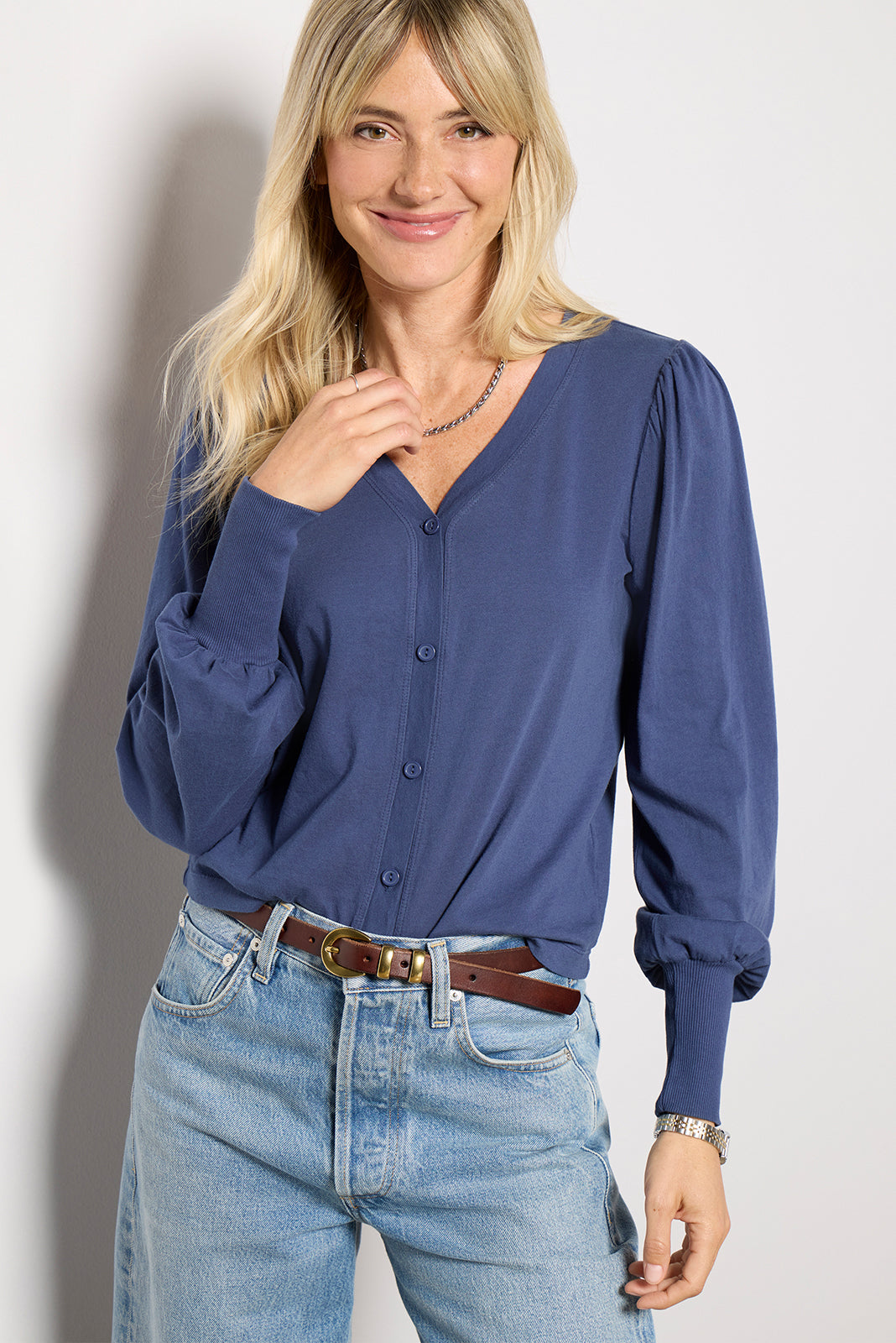 Long puff sleeves elevate this stylish button-front top by Bobi, crafted in soft cotton fabric with a v-neckline, slightly cropped fit, and extended ribbed cuffs.