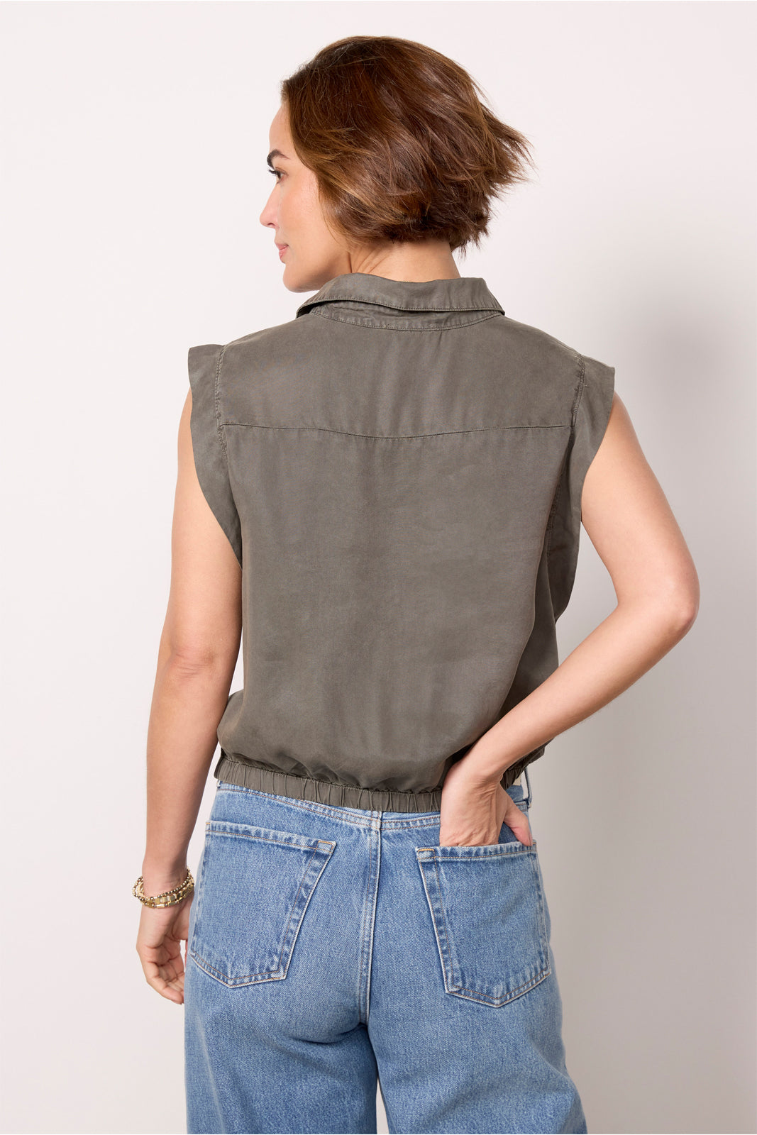 Elevate your everyday tops with this easy button-down from EVEREVE. Crafted in Lyocell, this top features a spread collar, a sleeveless silhouette with bra-friendly gussets at the arm holes, and a flattering twist at the hemline.