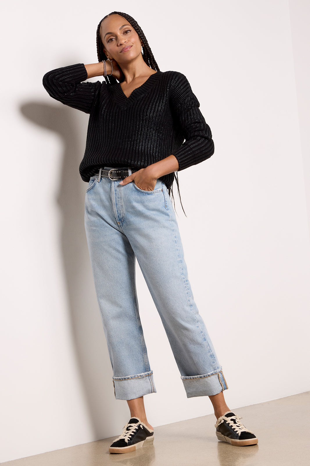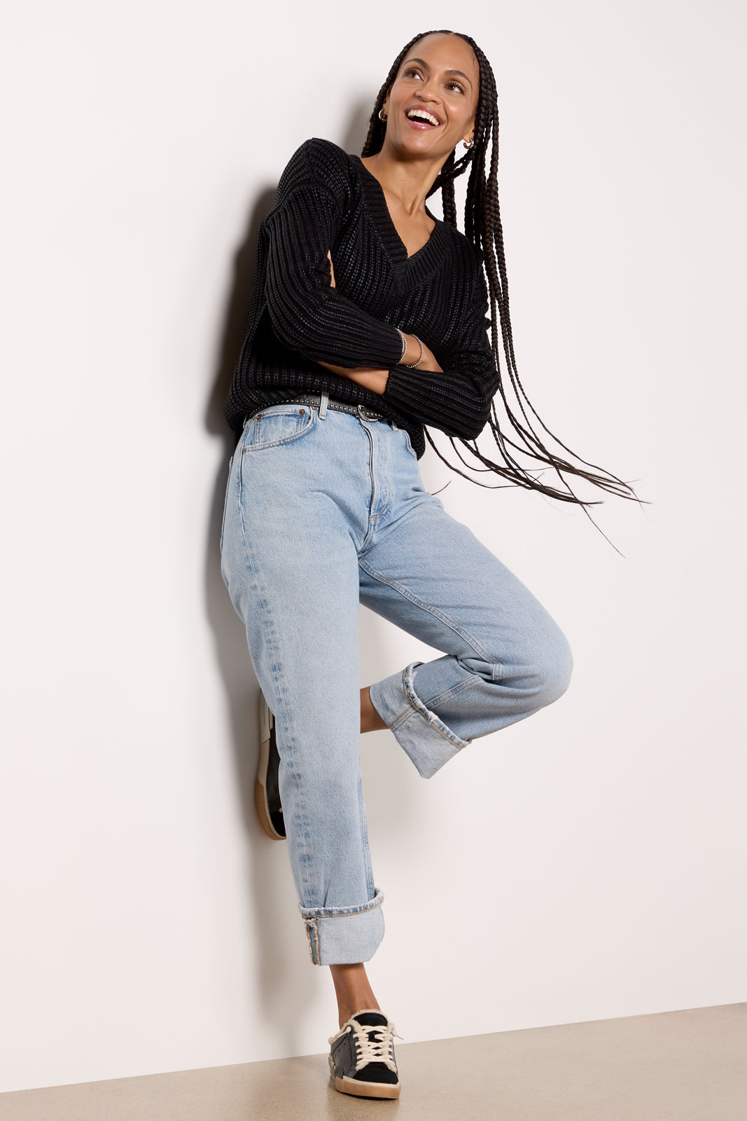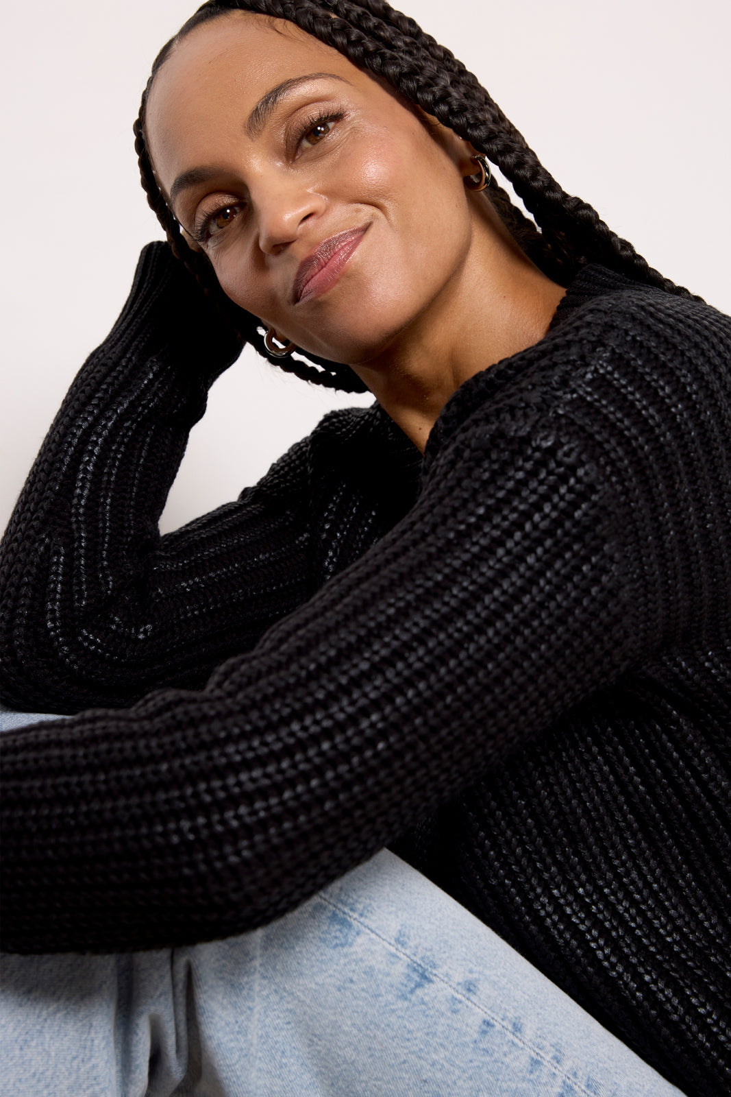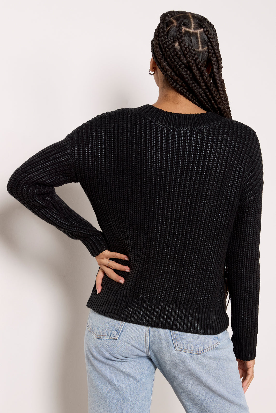The River Pullover will add a stylish edge to your sweater collection, finished in a coated knit with a v-neckline, dropped shoulders, and ribbed trim. Style for the season with jeans or a faux leather skirt.