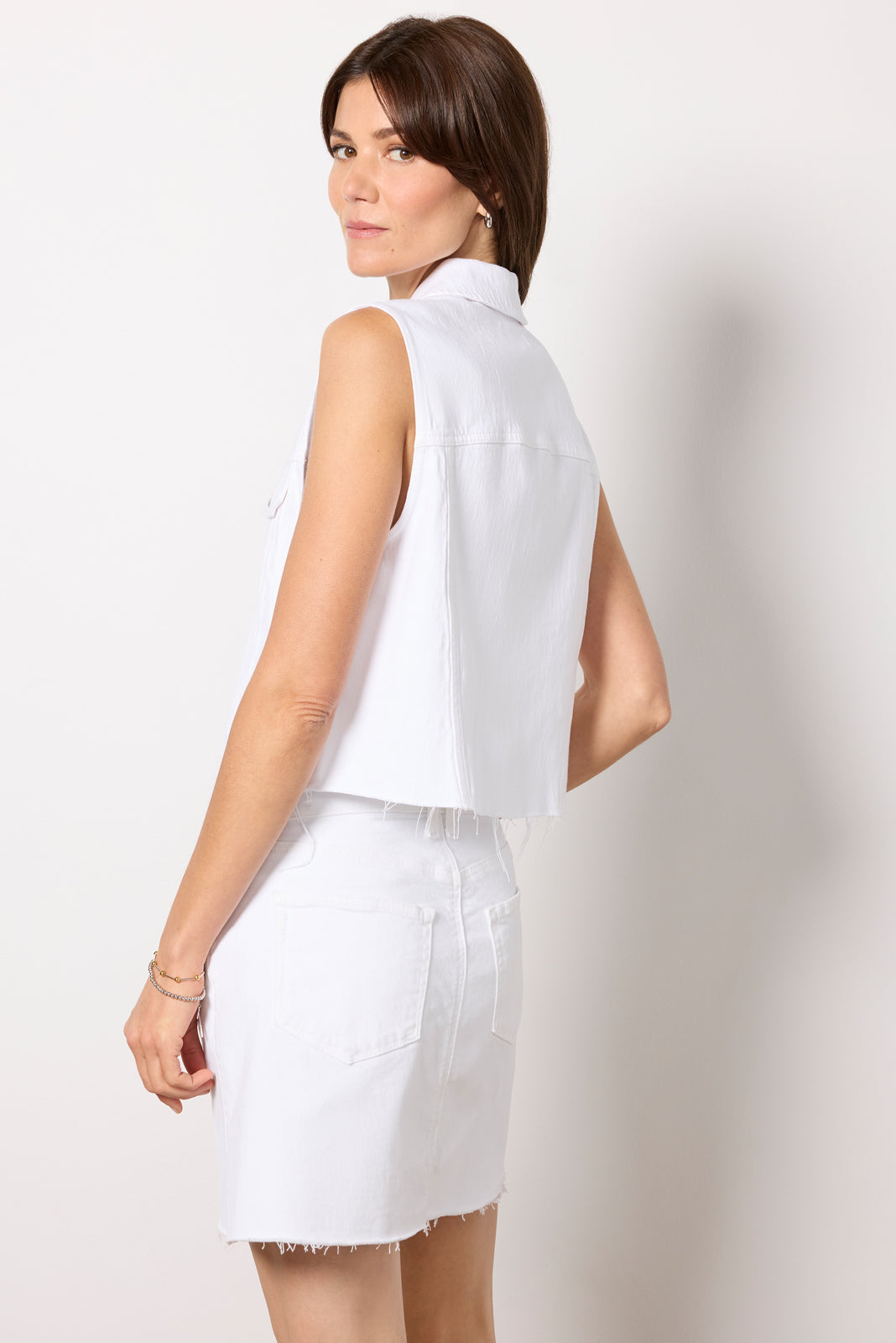 Refresh your layering collection with the Robbie denim vest by EVEREVE. Finished in cotton-blend denim, this versatile jean vest features a cropped raw hem, front button closures, and chest pockets.