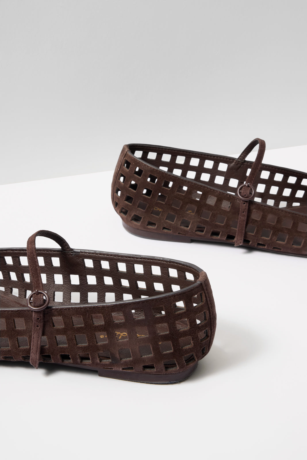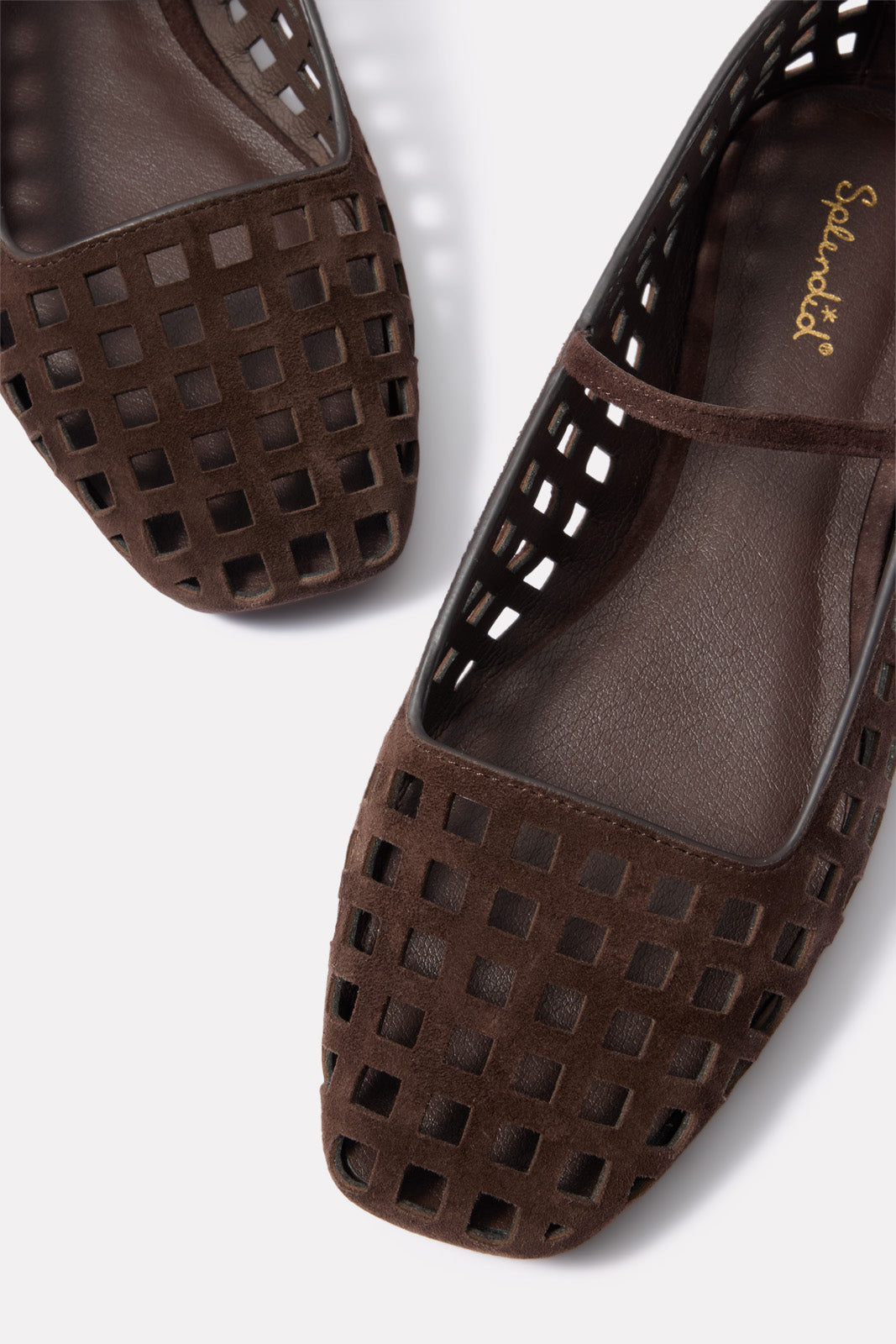 Rich chocolate suede and a breathable cutout design define these stylish Mary Jane ballet flats by Splendid Footwear, topped with an adjustable buckle strap.