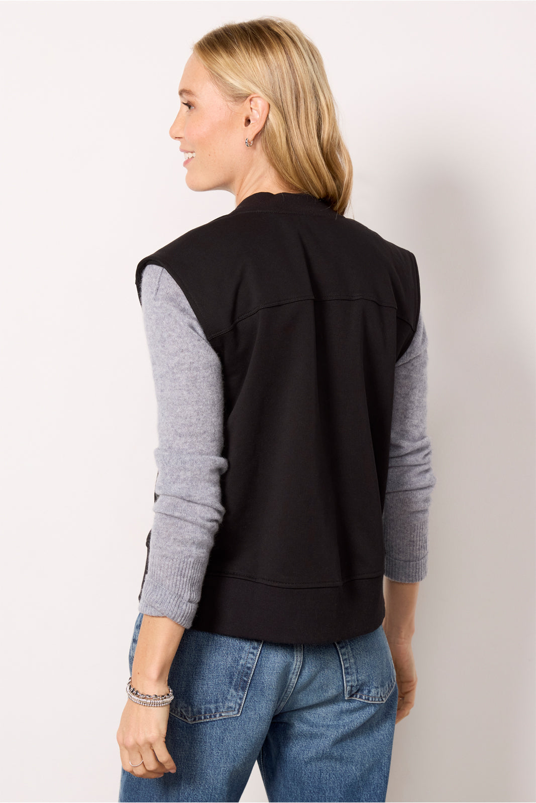 Layer your look with this stylish bomber vest by EVEREVE. Perfect for your transitional wardrobe, this sleeveless silhouette is crafted in cotton-blend knit fabric with a front zipper closure, round neckline, and zipper pockets.