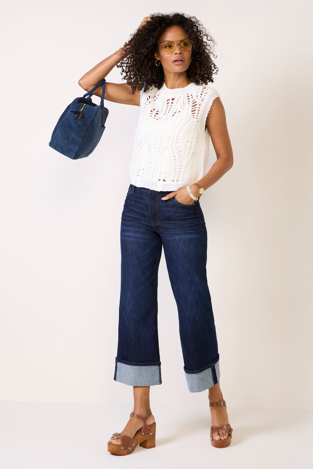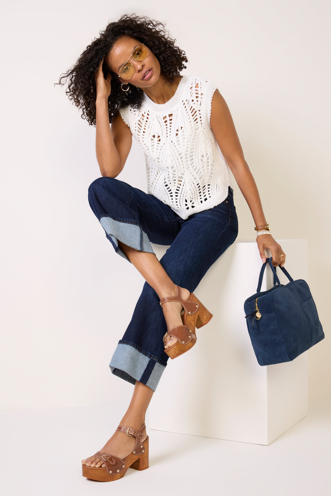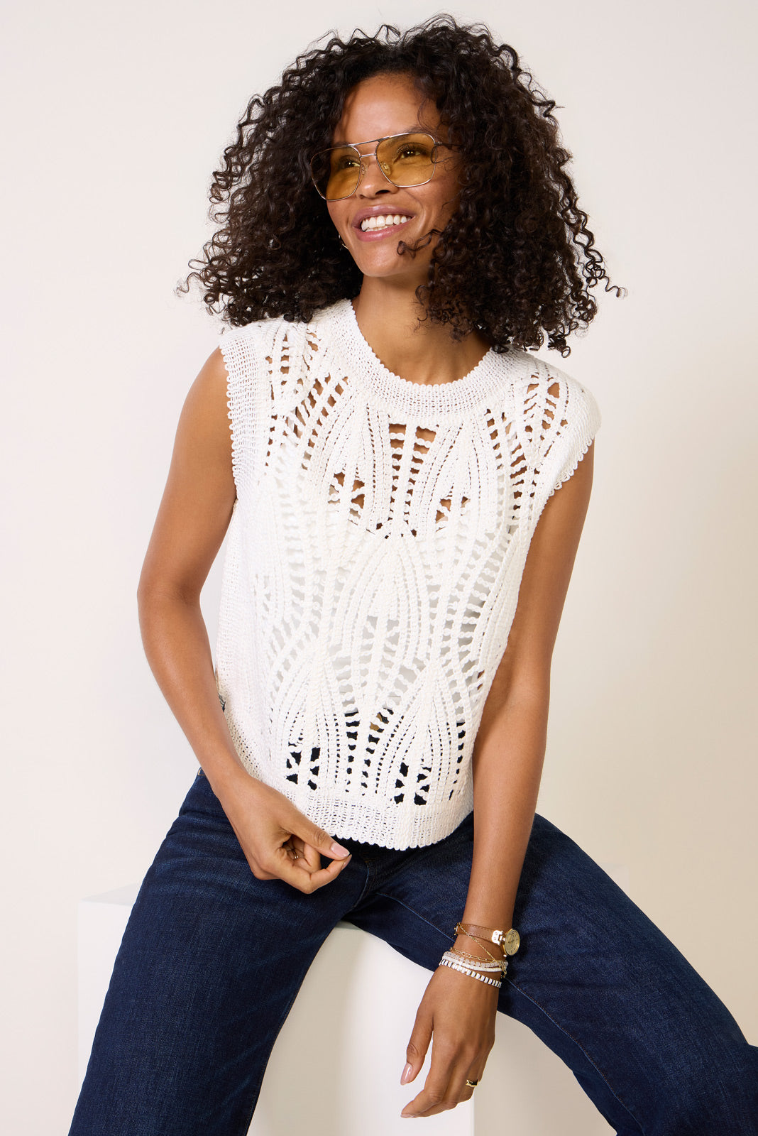 Open knit details define this easy sweater tank by EVEREVE, featuring a crew neckline, a slightly cropped silhouette, and a keyhole back button closure.