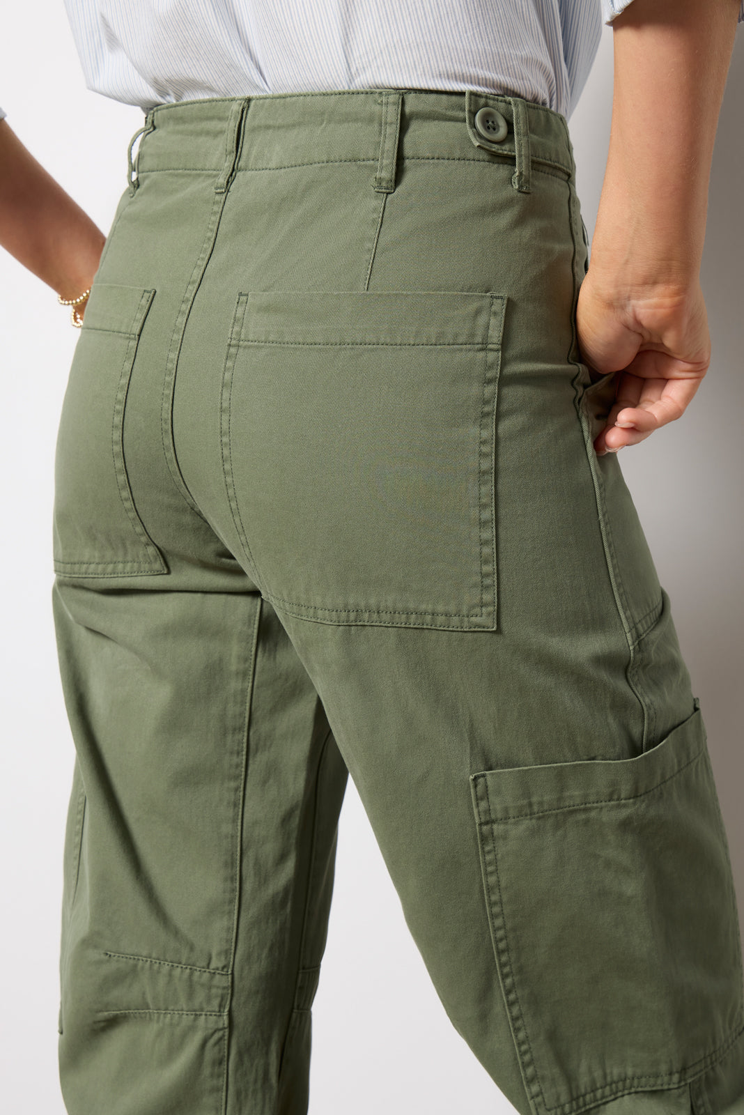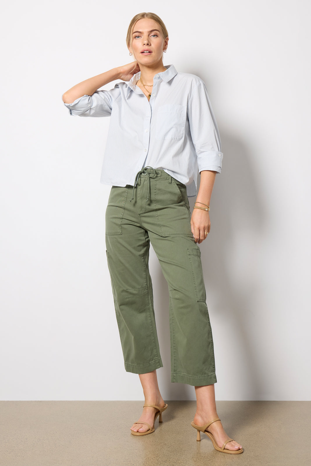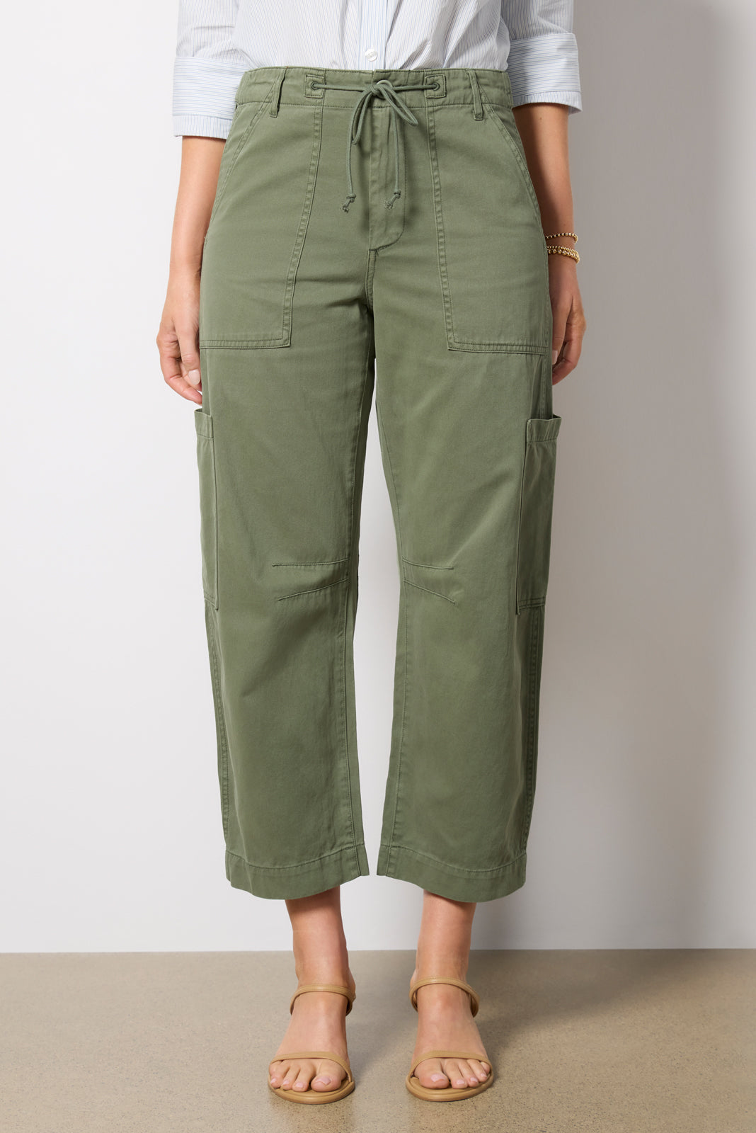 Relaxed yet refined, the Sabrina barrel pant by Pistola is crafted in structured cotton twill and features a curved leg silhouette with a high-rise fit, adjustable drawstring waist, and utility-style pockets.