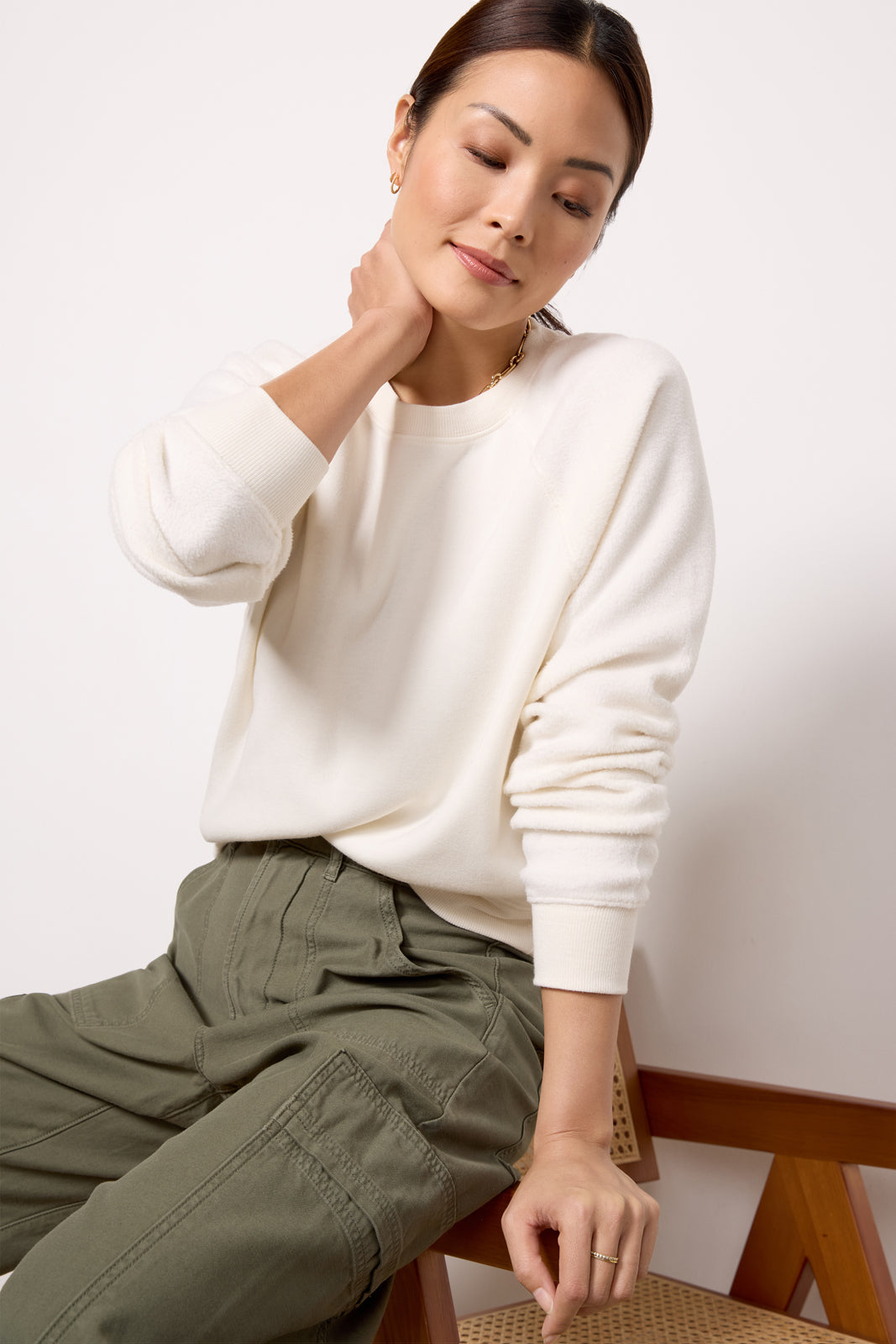 Stay cozy all day in the Saldana Reverse Fleece Top. Crafted in a comfortable mid-weight fleece fabric, this sweatshirt features a relaxed fit, raglan sleeves, and a crew neckline.