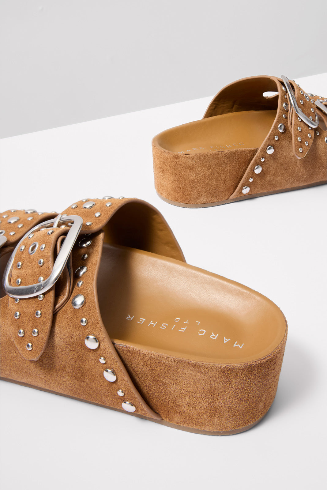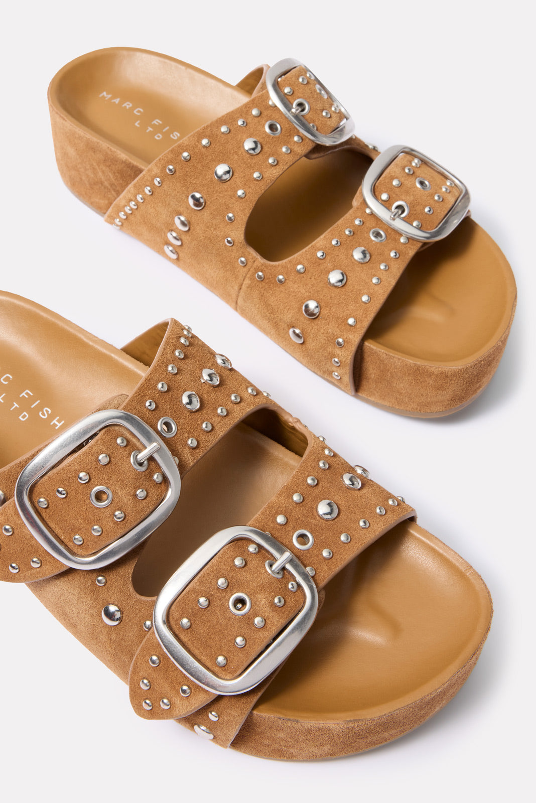 Give your summer look a lift with the Sayge flatform sandal by Marc Fisher LTD. Crafted in soft suede, these stylish slip-ons feature a platform sole, adjustable buckle straps, and silver stud details.