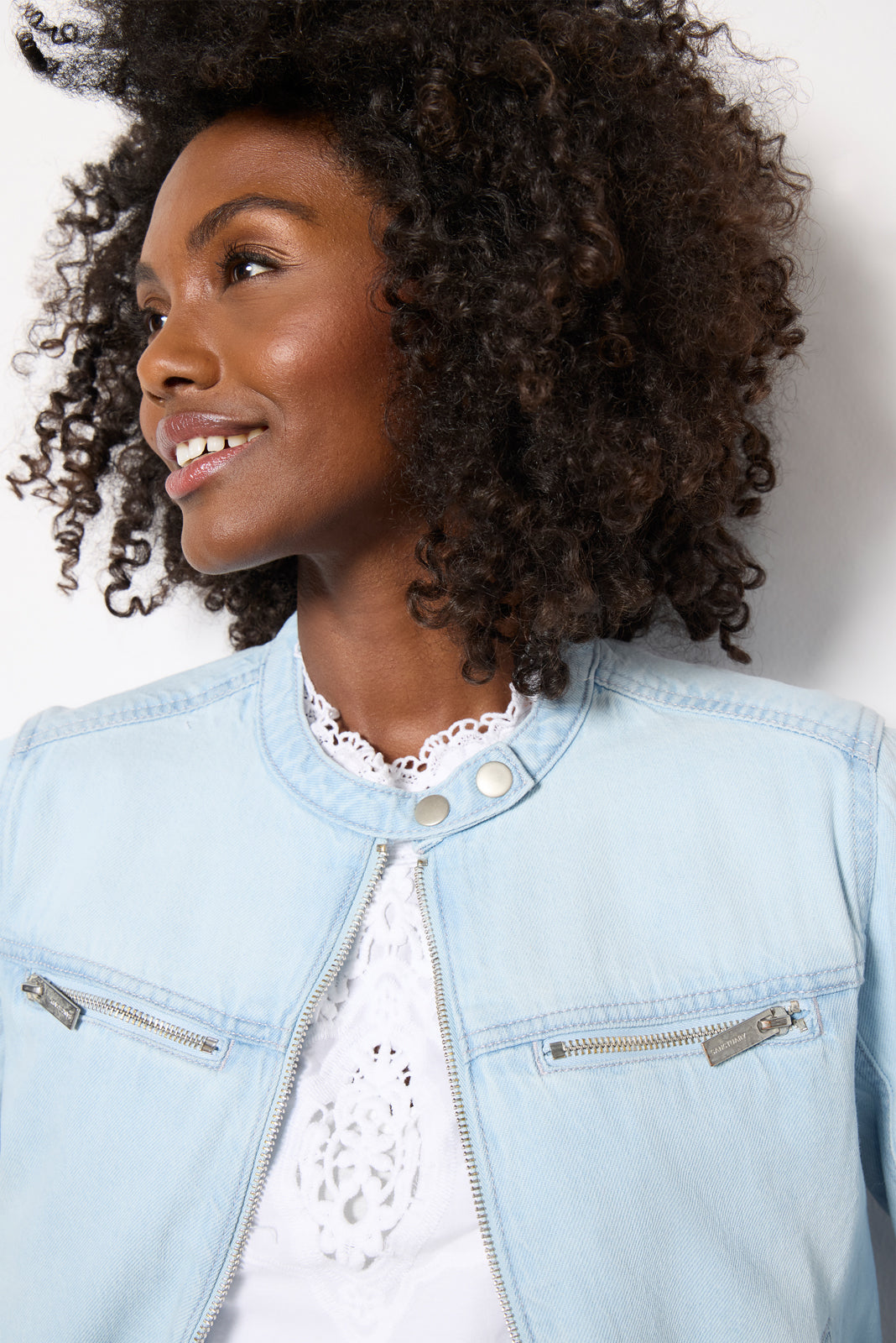 Level up your layering collection with this chic denim moto jacket by Sanctuary. This biker-style jacket is crafted in non-stretch cotton denim and features a cropped silhouette with a snap collar, side pockets, and zipper cuffs.