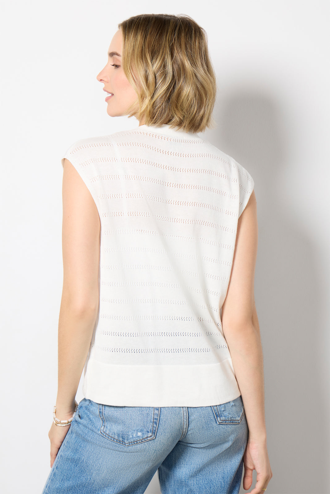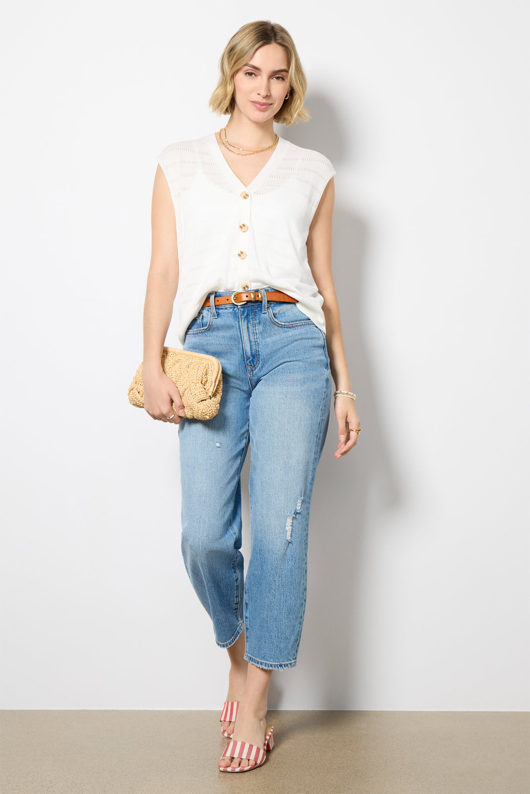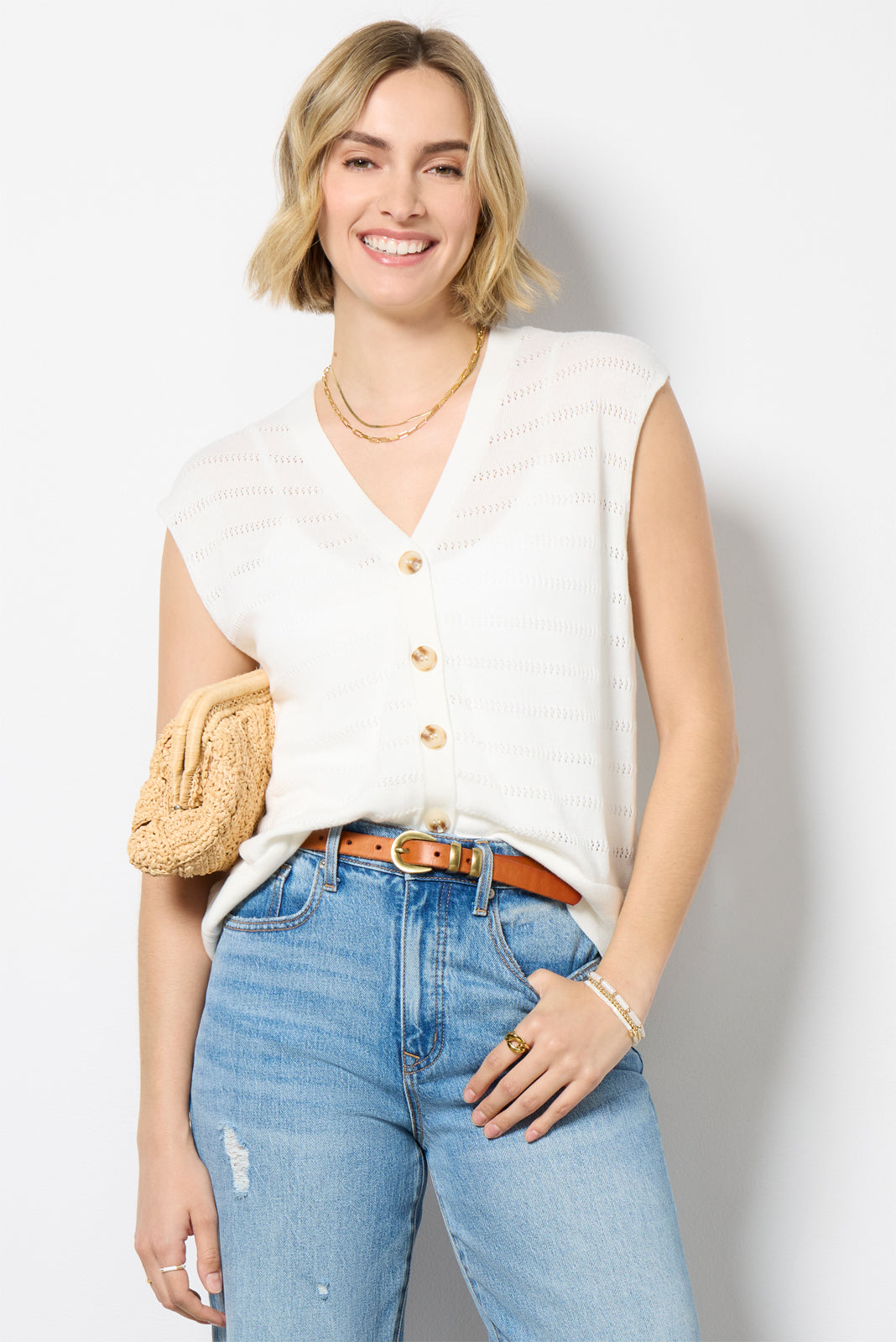Chic and summer-ready, the St. Kitts sweater tank by EVEREVE features a relaxed v-neck silhouette, finished in a semi-sheer knit with pointelle stripes and front button closures.